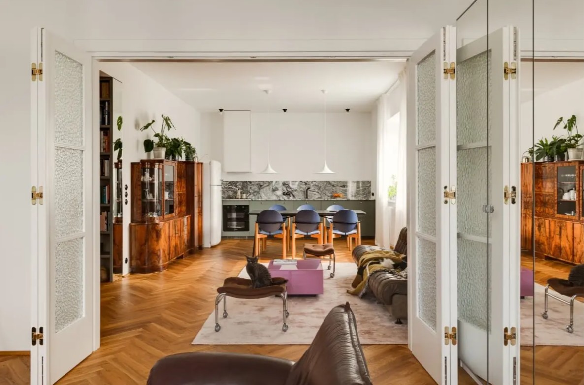 interior shot mocne wiat o z okna z prawej strony cienie mocne czarna lod wka green szafki