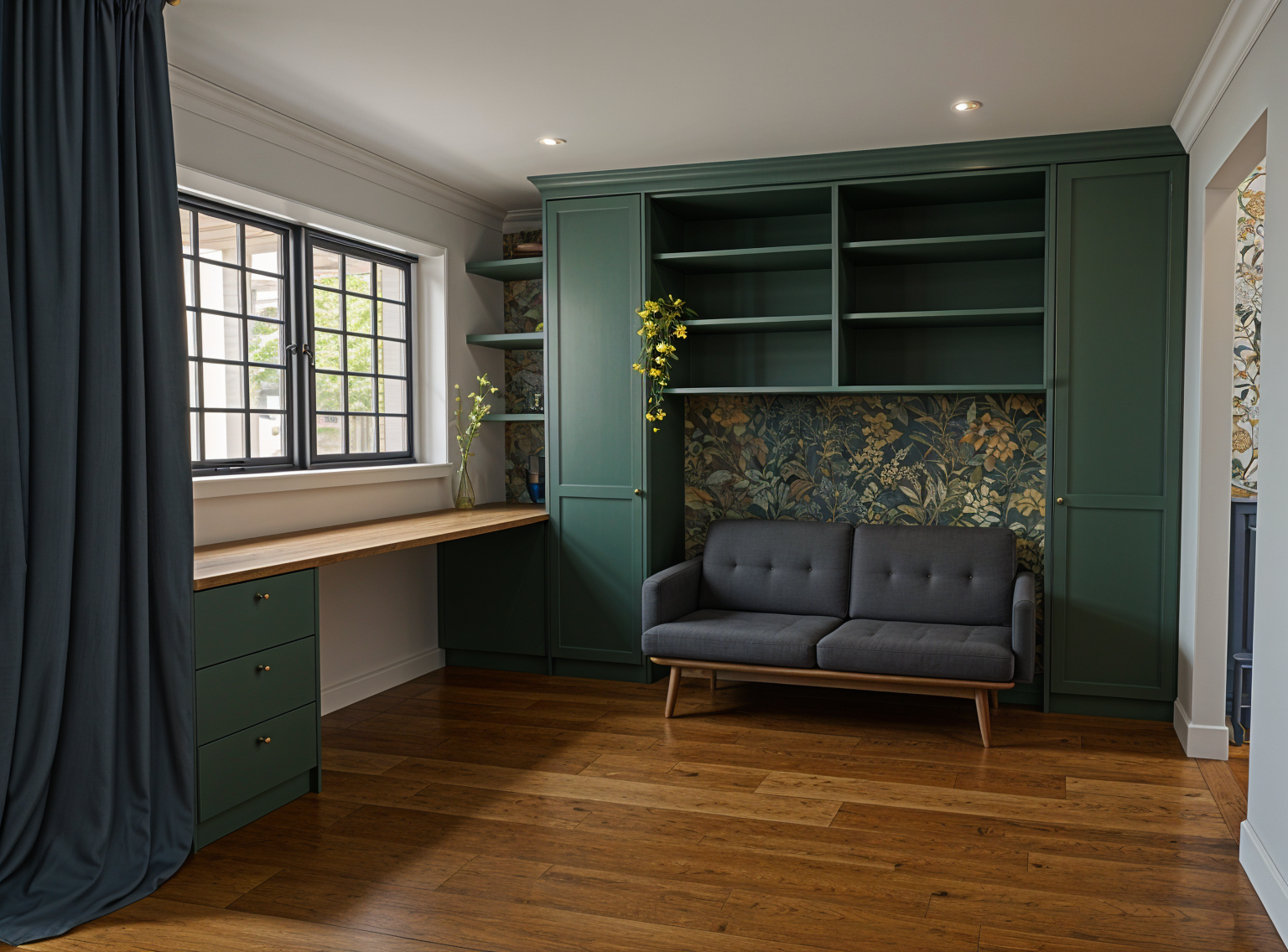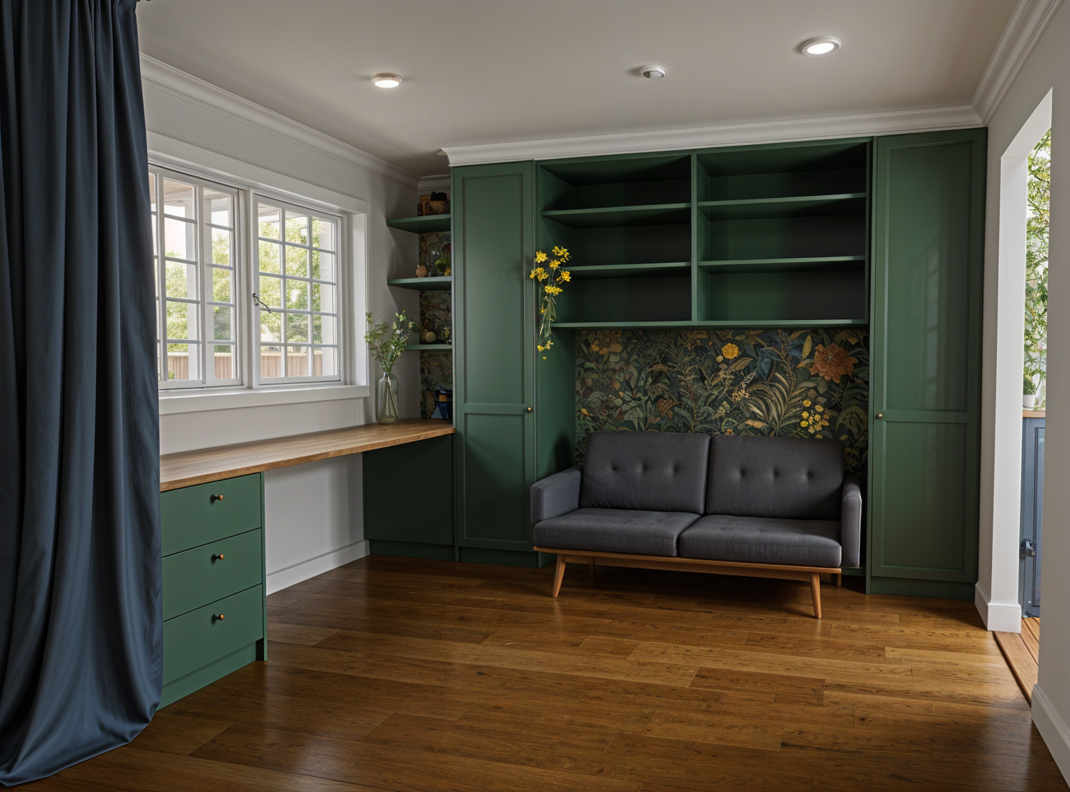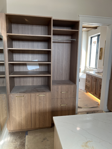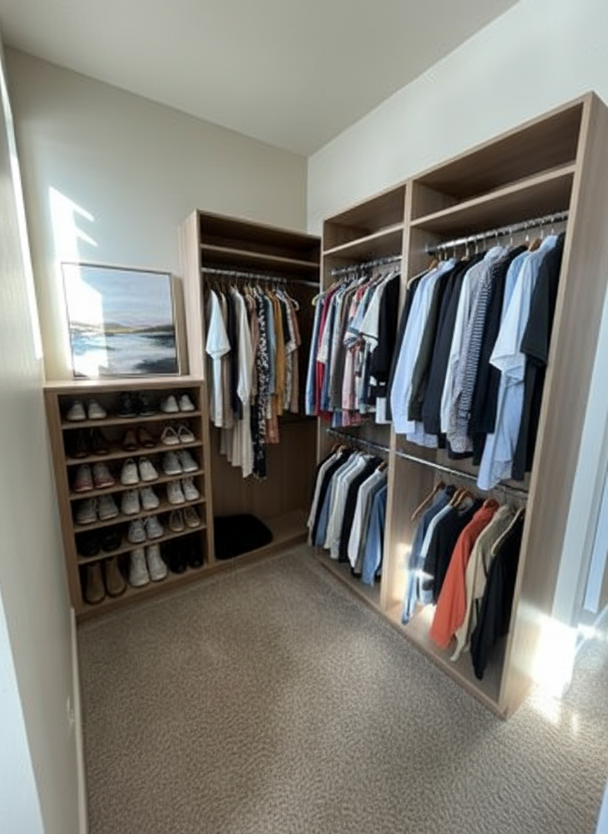 stage the closet with hanging clothes and folded clothes on the shelf remove the paper hanging add jewelry to the countertop accessorize and make the flooring carpet