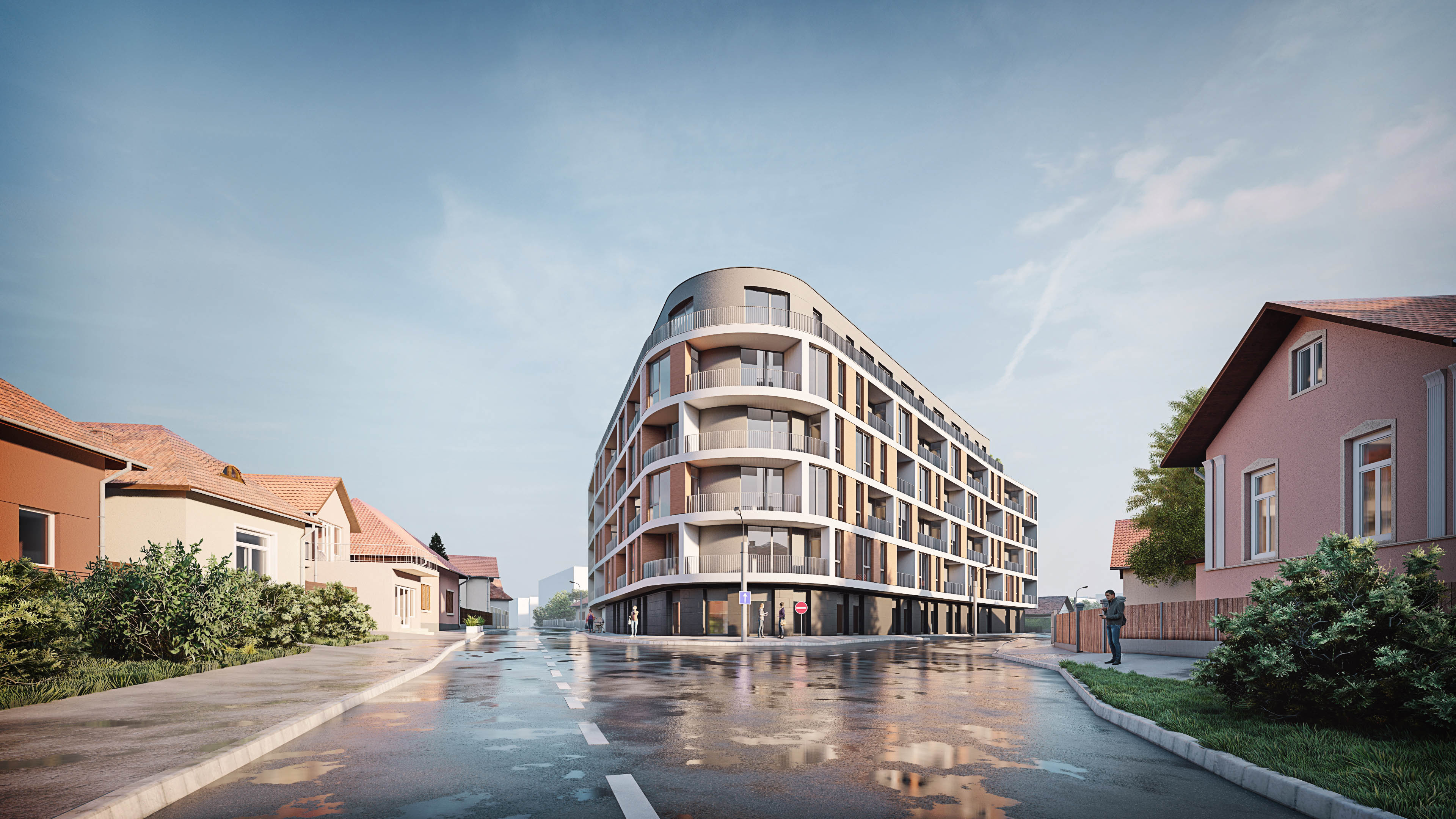 important preserve the existing geometry and the existing context exactly as provided do not modify alter reinterpret add remove scale or reshape any geometry do not change the site surroundings street layout neighboring buildings vegetation or context elements do not modify geometry scale proportions buildings road layout sidewalks or surrounding context in any way transform the render into a daytime scene with warm autumn lighting soft golden hour atmosphere clear light blue sky and warm directional natural light approx 4500k 5000k add a premium urban atmosphere with trees in autumn colors red orange yellow fallen leaves on the sidewalks and well maintained green areas cinematic lighting with long soft shadows balanced contrast natural highlights on the fa ades and subtle reflections in the glass surfaces include well dressed people in motion subtle motion blur light urban traffic modern cars and a discreet bus in the background for realism overall warm color grading calm and upscale residential atmosphere building materials should have realistic textures light concrete light brick clear glass with soft reflections high realism level contemporary architectural visualization style photorealistic sharp details without exaggerated contrast add subtle atmospheric haze in the distance for depth