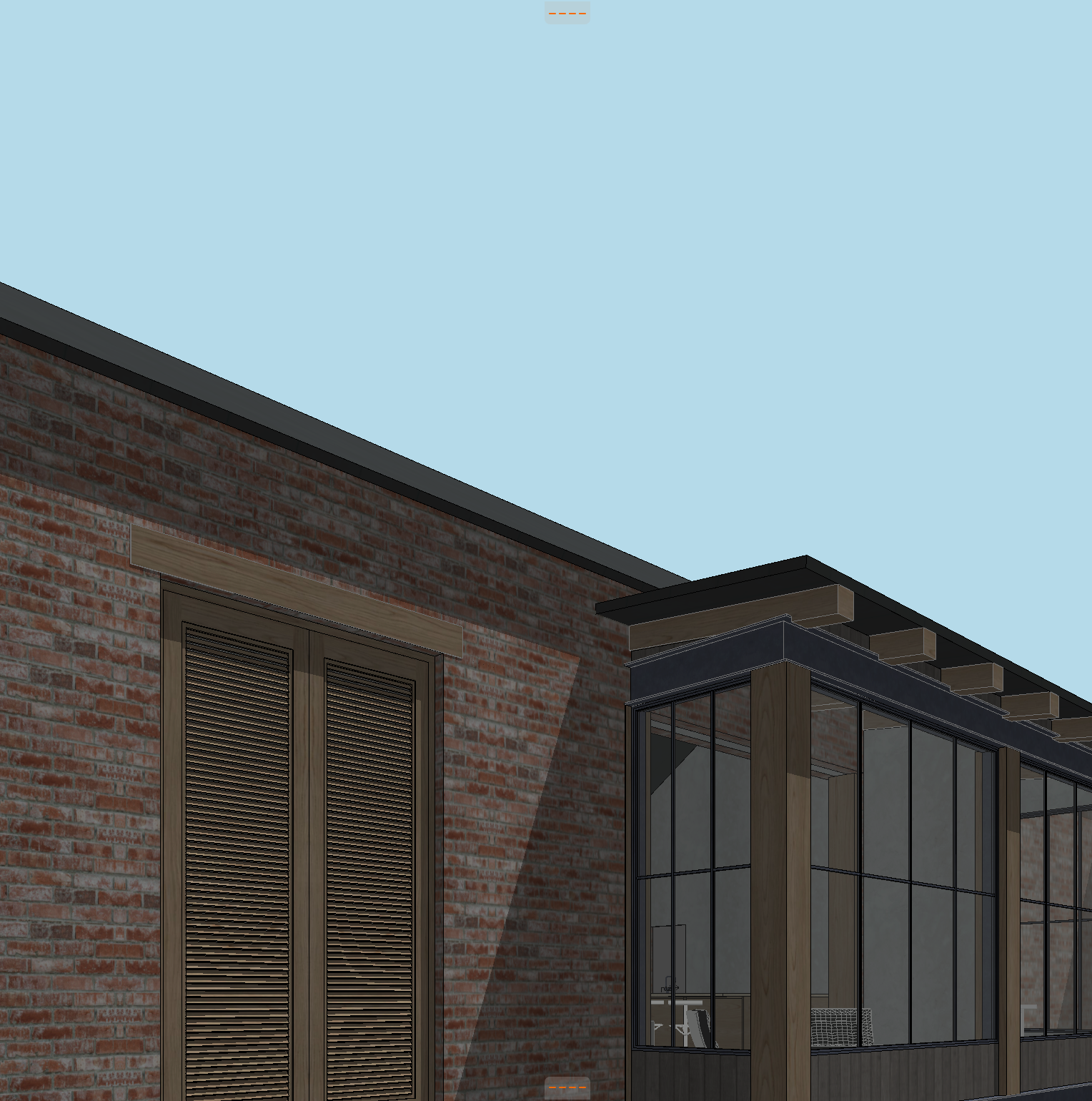 detail shot of an antique brick house with a soldier course at the top of brick walls with timber columns steel beams reclaimed pine soffit yellow pine trees in the background clouds in the sky