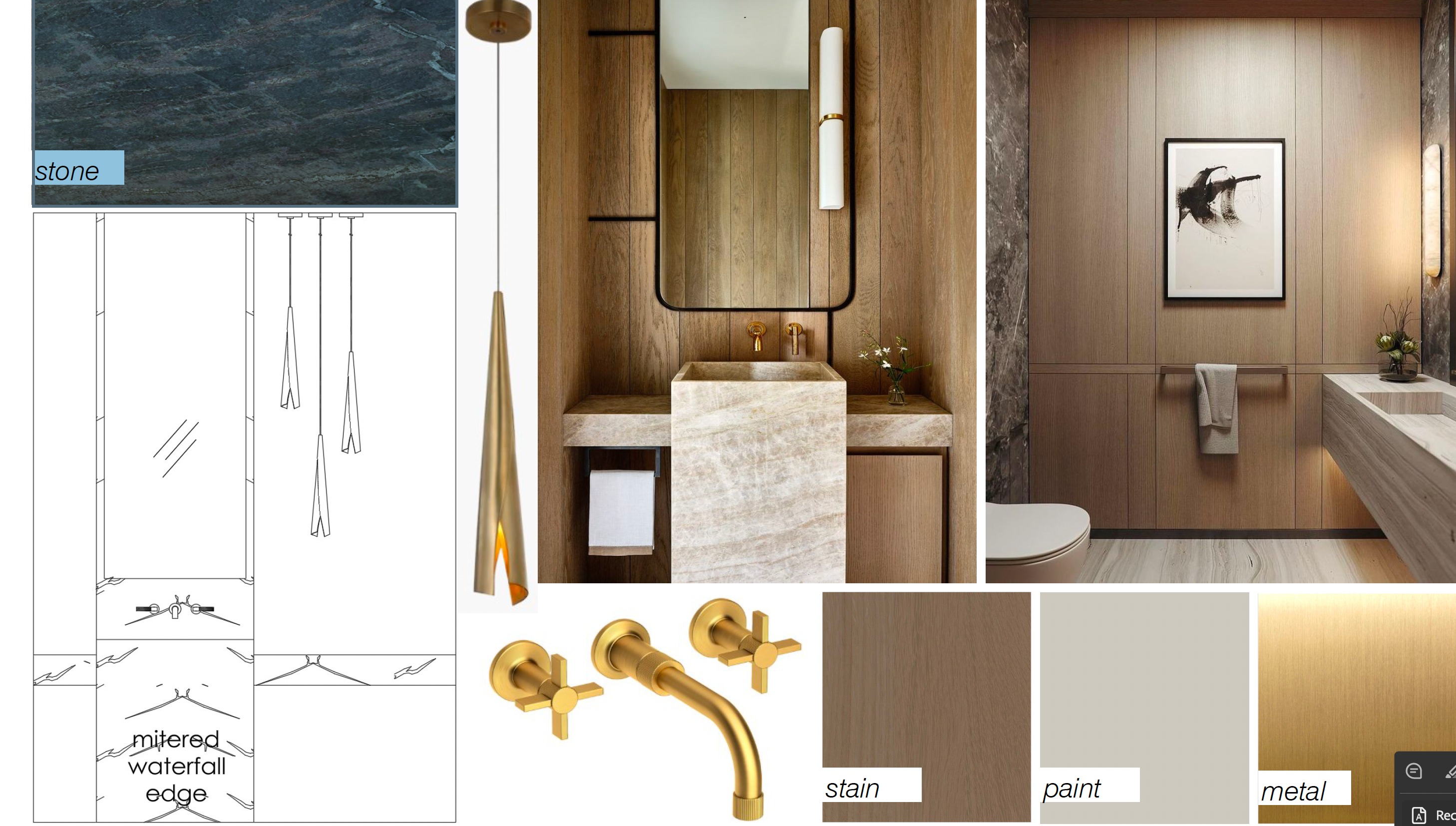 exterior shot use stone color for vanity and counter back wall to be stained panel color three brass decorative pendants in a cluster stone surrounds mirror that matches vanity wood floors great lighting