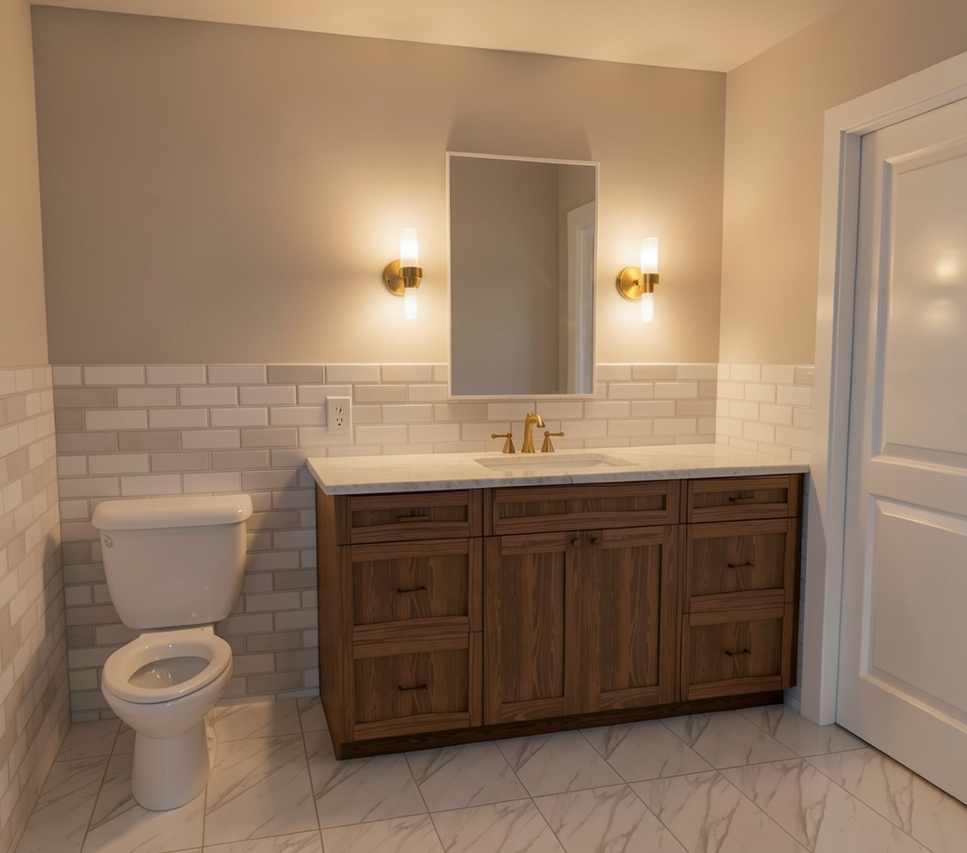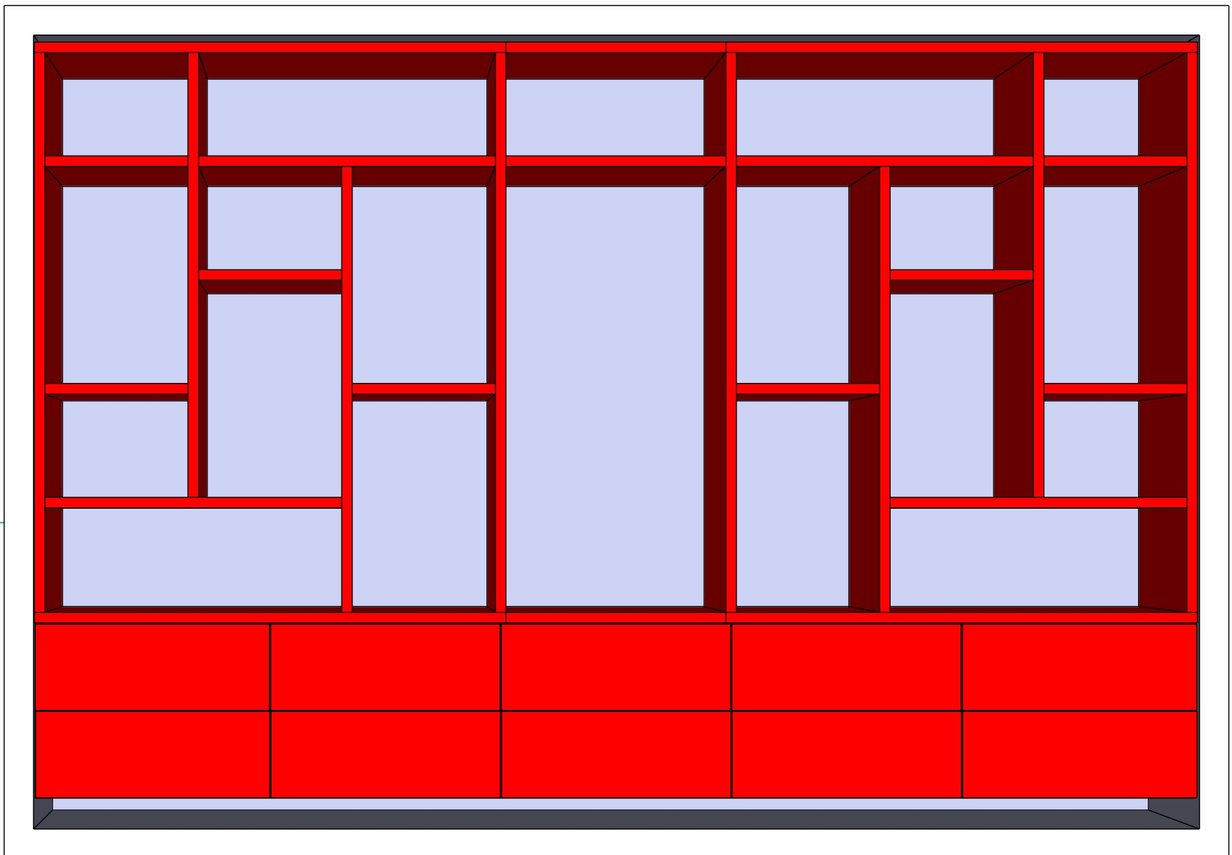 turn the red into walnut and the background must be a cashmere beige with warm indirect lighting on the shelvers and uprights create a mood and decorate the shelving modern contemporary with a large art piece statue in the center opening