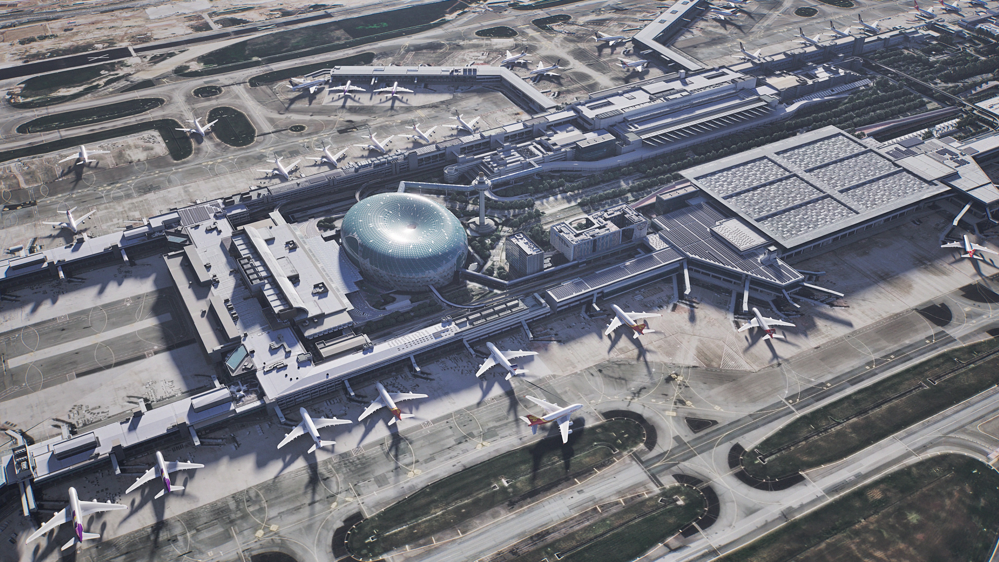 aerial view of a modern airport bustling with activity the terminal buildings are sleek metallic gray and reflect the sunlight the dome structure glistens in shades of reflective teal and silver creating a futuristic feel airplanes are parked along the gates their bodies painted in crisp white with accents of vivid red and blue runways and taxiways are neatly organized with faint yellow lines marking paths intersecting the expansive dark asphalt surrounding the airport patches of deep green trees and grassy areas add a touch of nature a bright clear sky overhead with a natural daylight from the morning sun casting soft shadows across the scene creating a serene and vibrant atmosphere