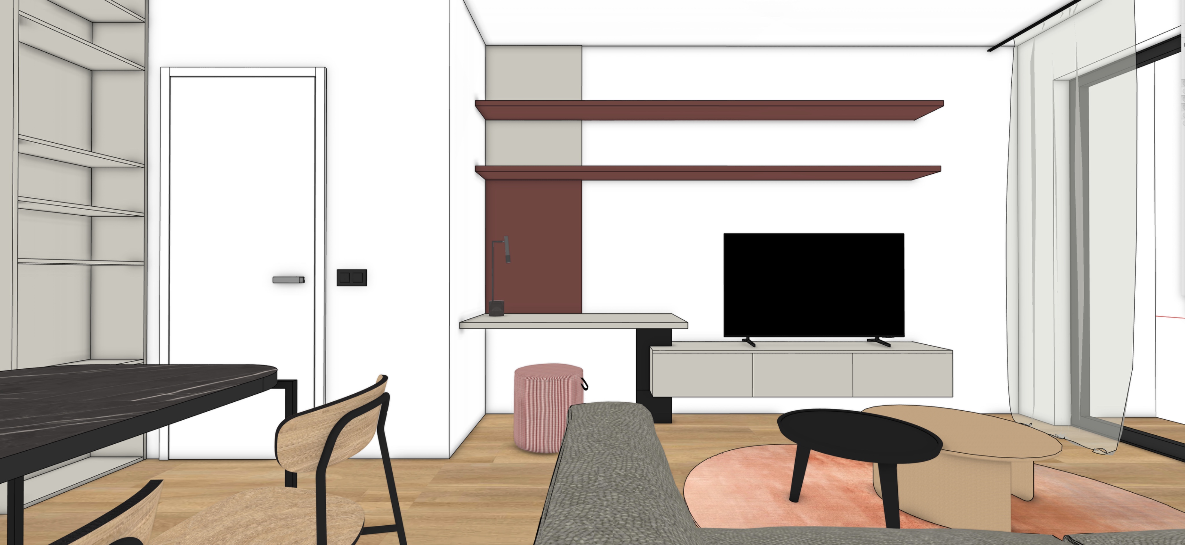 modern city living room matt finishes floor lamp switched on natural daylight light coming through large windows white walls tv wall in grey beige matt finish with red taupe shelves on the wall light oak wooden floor crisp details and nice textured on the upholstery