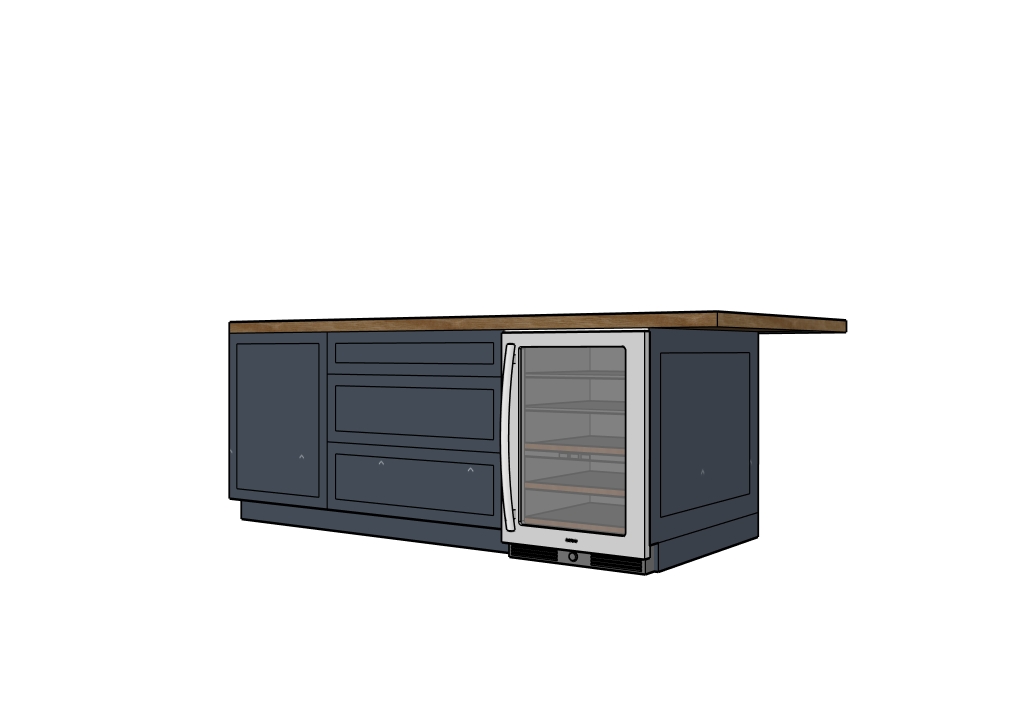 add beadboard to inset of right side panel only nickle tbar handles centered on all door fronts