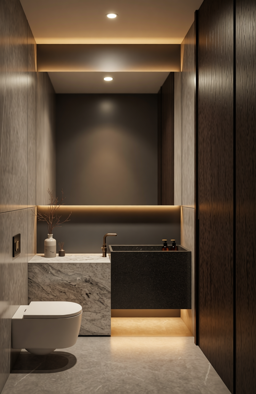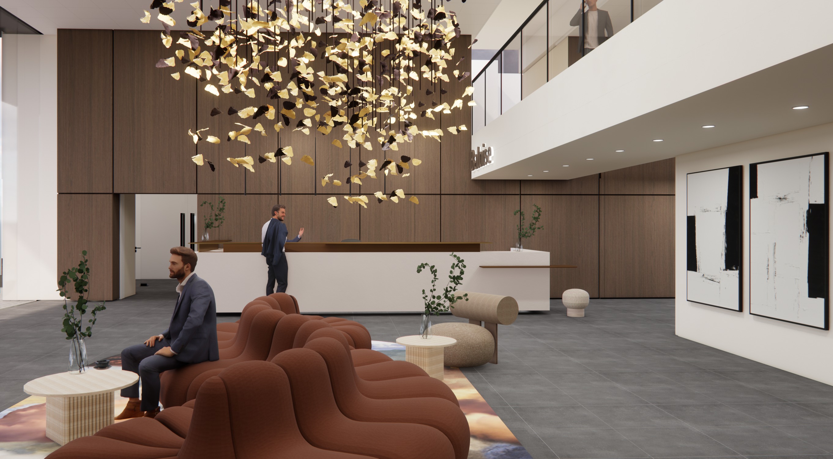 photorealistic 3d interior render of a warm and inviting reception area with a soft golden lighting atmosphere creating a cozy and elegant mood the entire wall is fully clad in walnut wood rich warm tones featuring a refined vertical and horizontal structured pattern architectural and rhythmic as per reference image a custom reception desk in mortex smooth mineral matte finish in a warm beige tone complemented by a brushed gold metal countertop subtle reflections premium detailing a design armchair in terracotta fabric soft texture and welcoming shape placed on a colorful cloud shaped rug with organic forms and warm hues high end contemporary interior design realistic materials and textures global illumination soft shadows accurate scale architectural interior photography style ultra detailed high realism