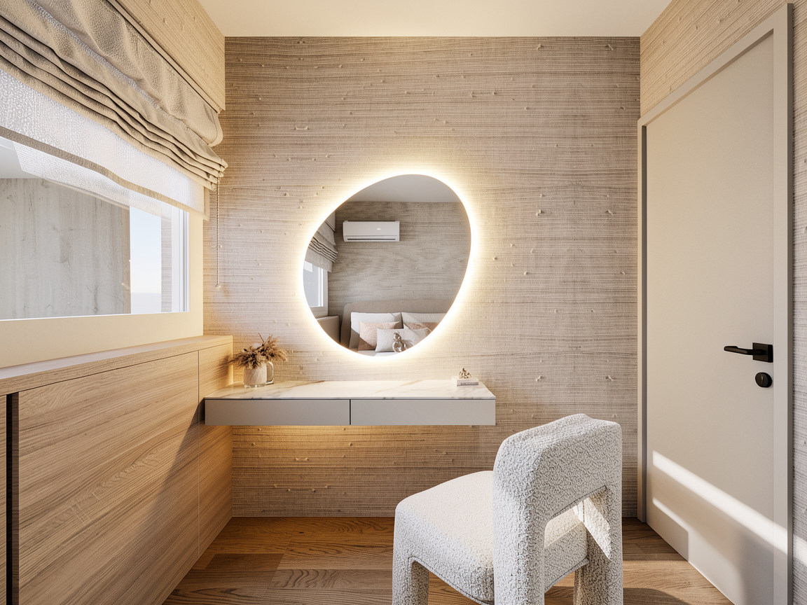 realistc view of a dressing table the chair is boucle off white on the left there is wood panel in a light tone the mirro has led lighting behind all around