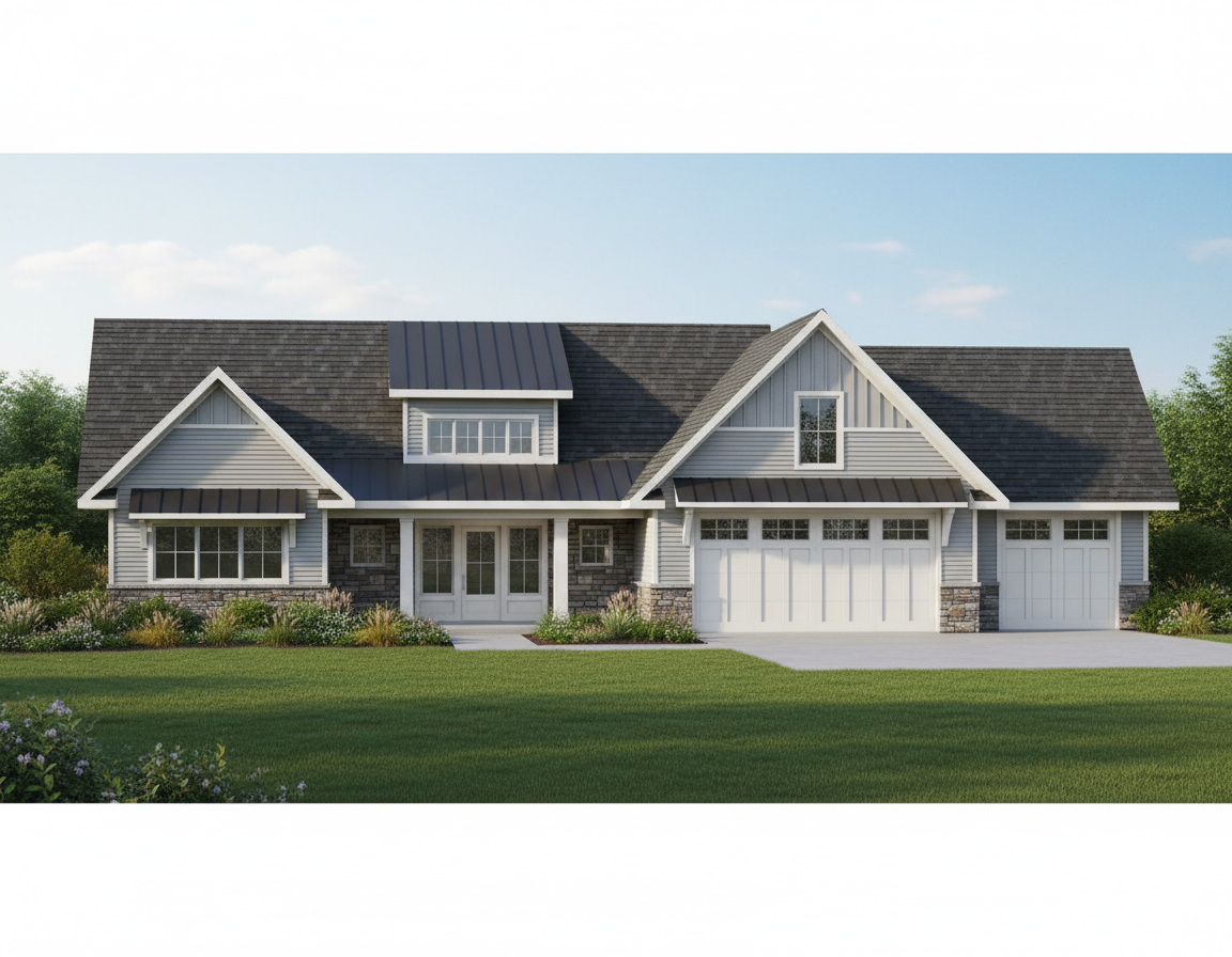 make as photorealistic as possible while keeping textures the same as selection professional landscaping in a lightly wooded scene with good lighting match materials to plan and remove any text light grey siding white trim windows black solid frontdoor