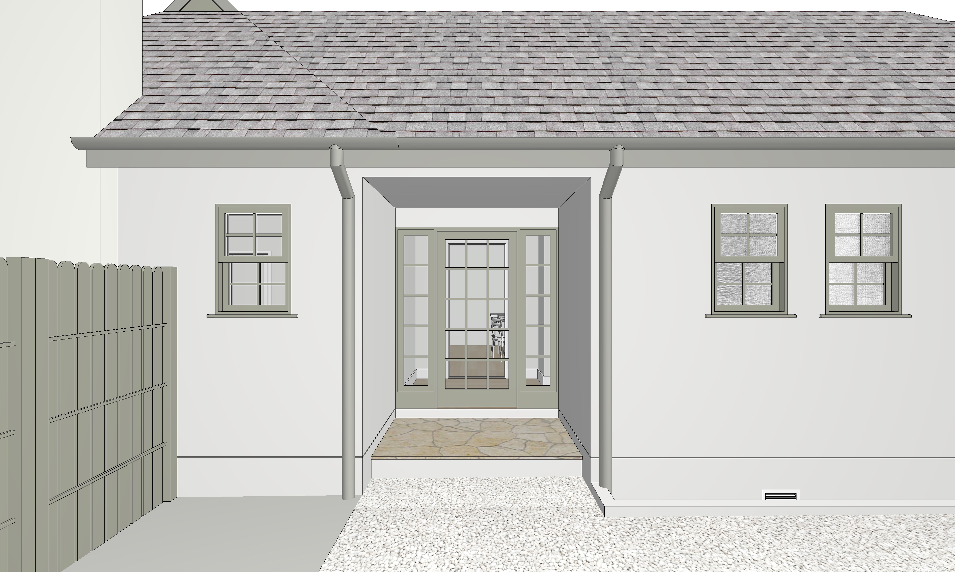 white stucco walls very pale gray green trim gravel paths stone patio frosted glass to windows on the right side dusk lighting with all windows backlit