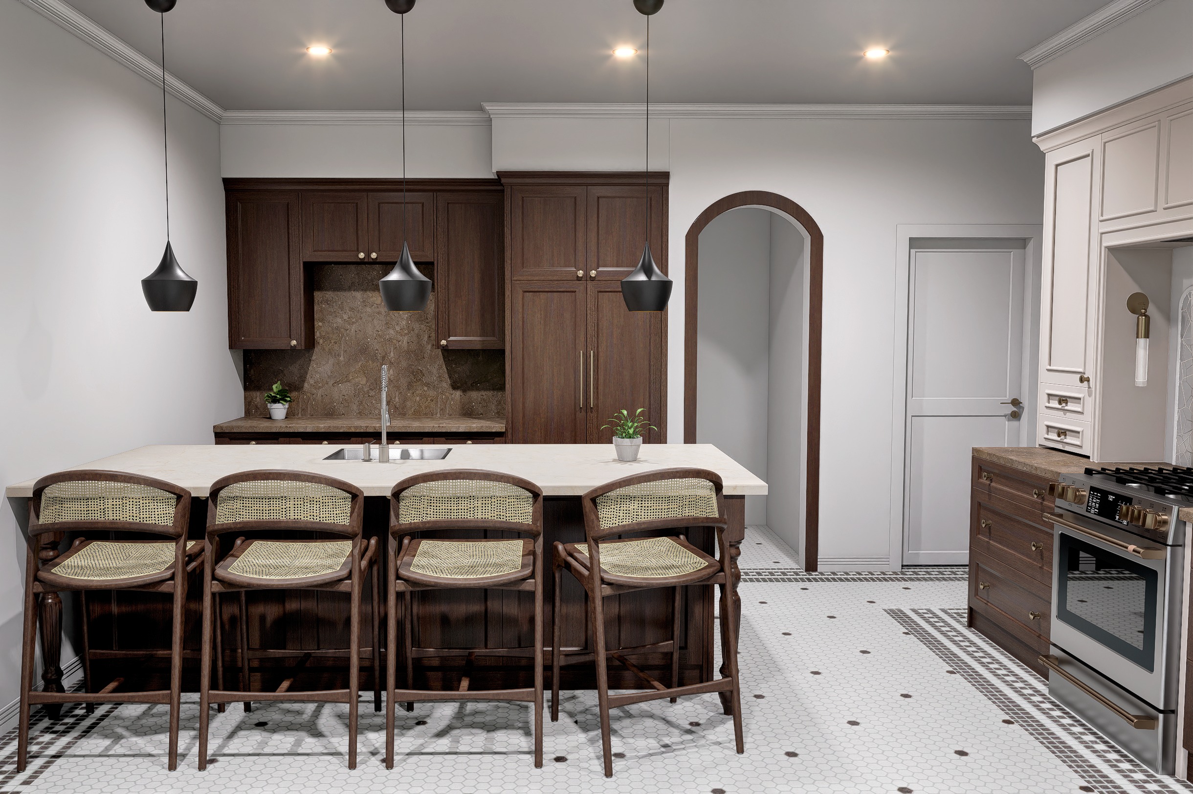 above the wood cabinetry should also be wood including the crown moulding only above the wood cabinetry the rest of the crown should remain white also add a picture light above the 4 upper cabinets