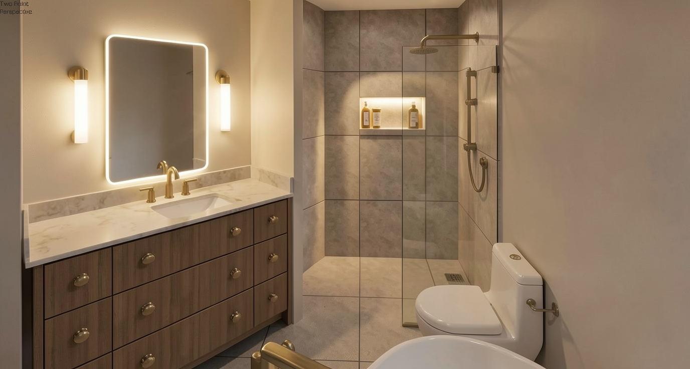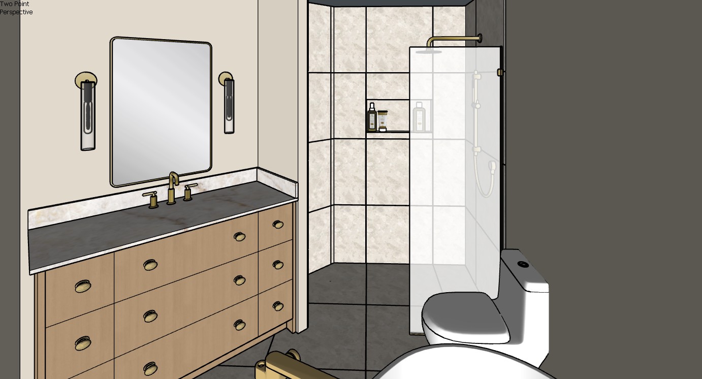 remove natural sunlight on the vanity remove window on right hand side of the wall remove all natural lighting in bathroom as there is no windows remove sunlight turn on led lights in shower niche and wall scoonces tone down the wall sconce lights add towel ring on wall on right hand side of right sconce
