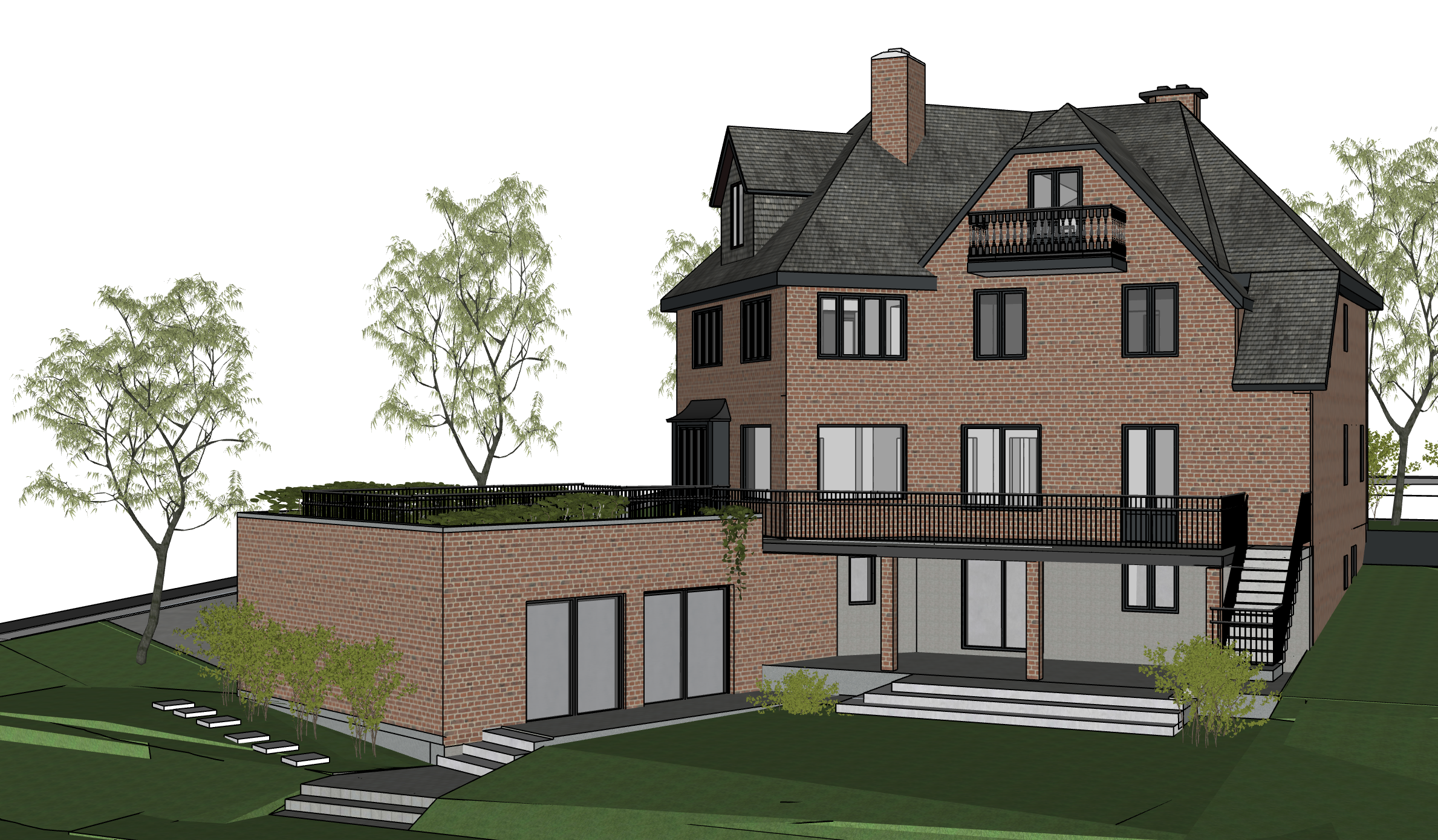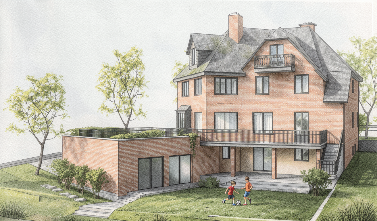 create a presentation sketch napkin style image keep all colours is same tones as in the image provided keep all proportions the same add only 2 small children playing soccer in grass to scale smooth out grass
