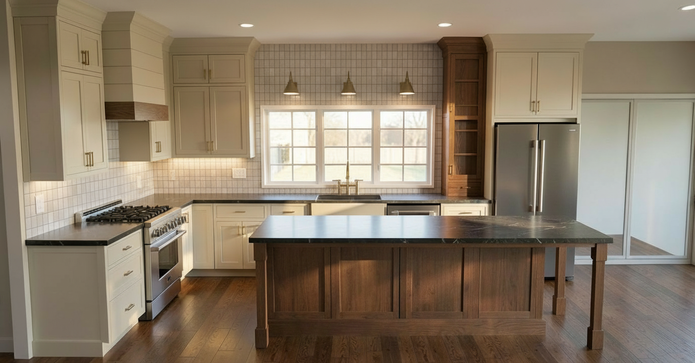where the field of tile is on the right is the side view of a small curbless shower bathroom and shower flooring is all the same and on the same plane with frameless glass and brass fixtures shower head on right wall floor at bathroom and shower the same material and plane