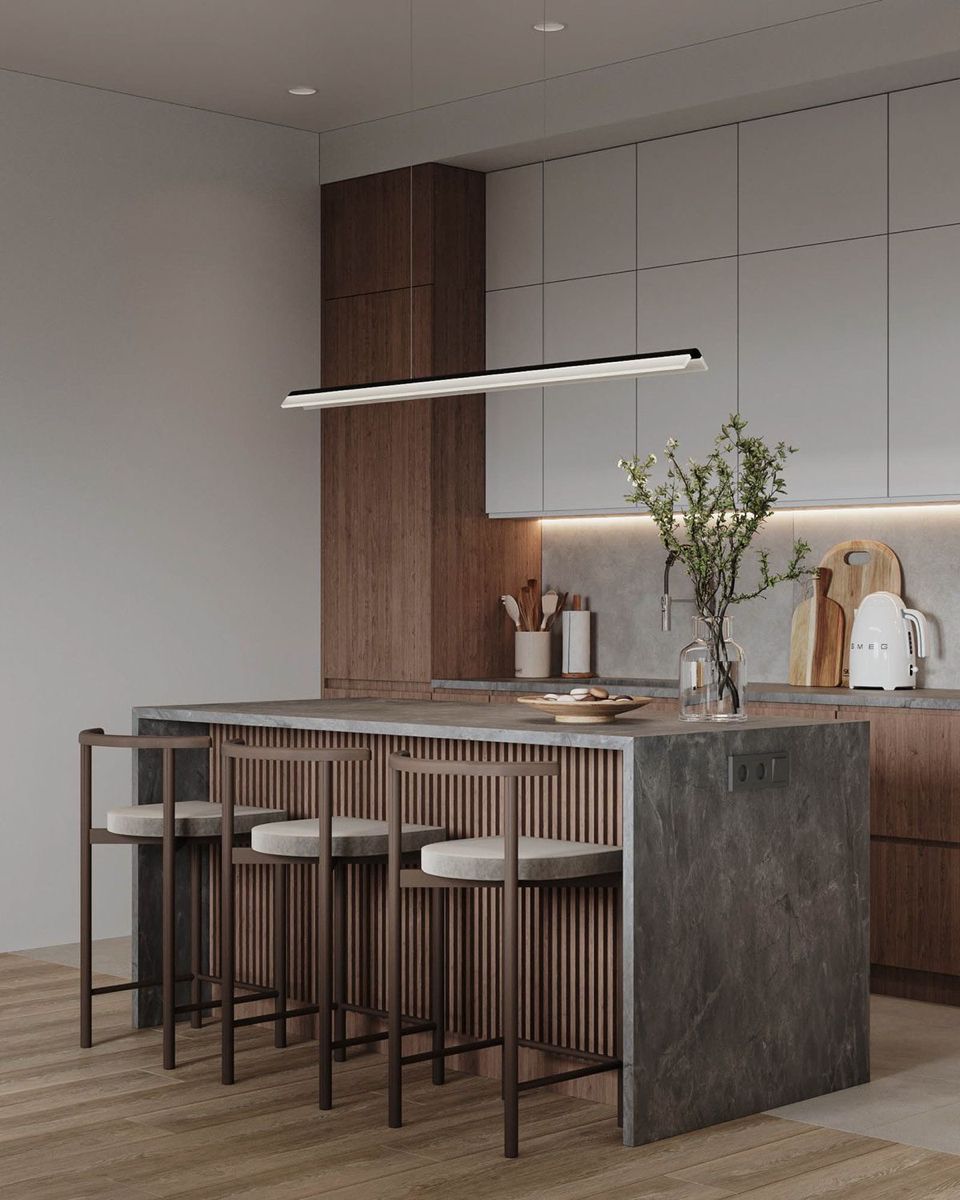 brutalism interior shot kitchen design dark marble and dark wood industrial style architecture