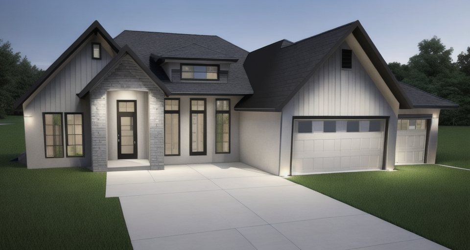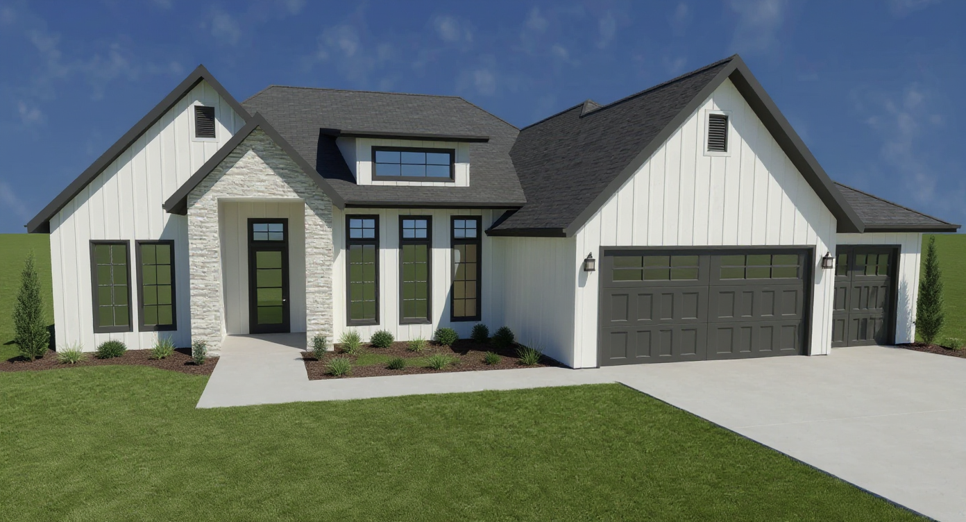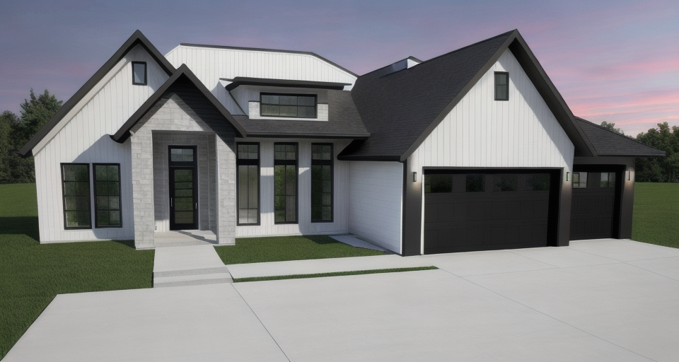 modern exterior shot create a realistic front elevation rendering of a luxurious single story home located in columbia missouri the house should have a white exterior black framed windows and a 3 car garage with a driveway leading up to it add modern landscaping with greenery and accent plants in front of the house and include some stone detailing on the front fa ade for texture and contrast the overall look should be elegant high end and timeless fitting the luxury custom home style common in columbia mo neighborhoods like old hawthorne or the gates architecture