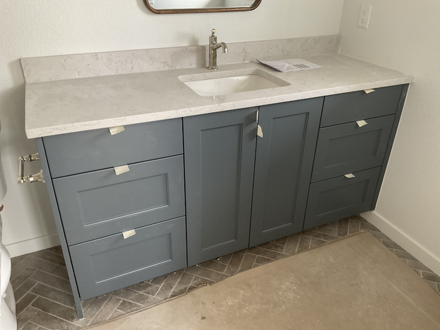 do not change the cabinets in any way preserve the exact cabinet colors materials finishes dimensions door and drawer styles hardware spacing alignment and all geometry exactly as shown do not alter the countertop shape backsplash appliances flooring lighting fixtures or wall structure only remove the construction materials clutter and mess from the scene clean the room and make it look finished and staged add a few simple tasteful home accessories appropriate for the style of the space but do not add or remove any furniture windows or architectural elements maintain the original lighting direction and realism enhance clarity and polish the photo while keeping the cabinetry and room design completely unchanged do not alter the lighting to keep the cabinet colors as they are in the image add brushed nickel pulls to the door and drawer fronts stage the countertop add toilet paper to the holder on the left