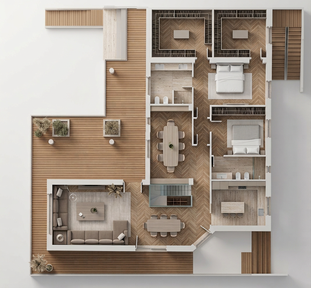 convert this floor plan into a realistic isometric 3d view of a full house show the space from an elevated angle with furniture walls and details visible modifica questa immagine togliendo il tavolo da pranzo all ingresso e l elemento che hai aggiunto davanti alla scala use the same furniture as shows on the plan do not change the orientation of the floorplan