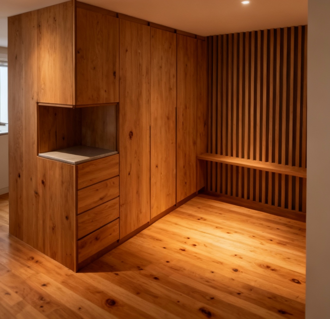dayligtht feeling in a warderobe with an oak veneer flooring and oak veneer cabinets the stickwall in the background to the floor an without the horizontal panel