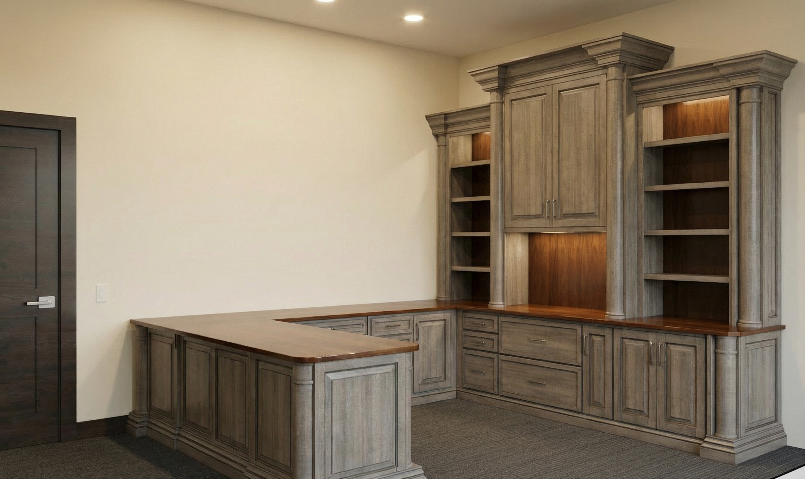 highly realistic interior kitchen rendering shown from a centered frontal perspective that captures the full depth of the kitchen including the island in the foreground perimeter cabinetry appliances and circulation path with accurate scale and natural proportions the kitchen features full height cabinetry finished in a soft muted sage green tone with a smooth matte finish and subtle panel detailing all upper cabinets extend fully to the ceiling creating a clean built in appearance cabinet doors and drawers are styled with simple understated hardware in a warm metal finish maintaining a cohesive and timeless look a large central island anchors the space finished in a natural warm wood tone with visible wood grain and a refined matte finish the island has clean panel detailing and supports a light stone or quartz countertop with a smooth surface and minimal veining the island is proportioned accurately in relation to the surrounding cabinetry and floor space the perimeter countertops are finished in the same light stone or quartz material creating visual continuity throughout the kitchen the backsplash is a full height light stone surface extending seamlessly from countertop to upper cabinets reinforcing a clean and cohesive design built in stainless steel appliances are integrated into the cabinetry including a refrigerator and other concealed appliances maintaining a streamlined appearance above the island two pendant lights are suspended featuring brass toned stems and light colored pleated or faceted shades providing focused task lighting and a decorative accent the ceiling is finished in clean white and fitted with evenly spaced recessed spot lights delivering balanced functional illumination throughout the space the floor is finished in warm medium tone wood flooring laid in a consistent linear pattern that enhances the sense of depth and flow within the kitchen on the right side a window above the countertop brings in natural light the window is dressed with a soft neutral roman shade subtly patterned and kept in a raised position allowing daylight to filter into the room without overpowering the space bar seating is placed along one side of the island featuring counter height stools with slim dark frames and upholstered seats in a muted neutral green tone complementing the cabinetry without competing visually walls are finished in soft white with clean trim and crisp edges the overall lighting is soft natural and evenly balanced combining daylight with artificial lighting to avoid harsh shadows or overexposure the rendering style reflects a sketchup based architectural visualization characterized by clean outlines precise geometry accurate proportions and realistic but restrained material textures the camera angle is natural avoiding wide angle distortion ensuring all elements read at true scale no elements are added removed or modified the prompt is intended solely to enhance realism while preserving the exact design layout and materials shown in the original image