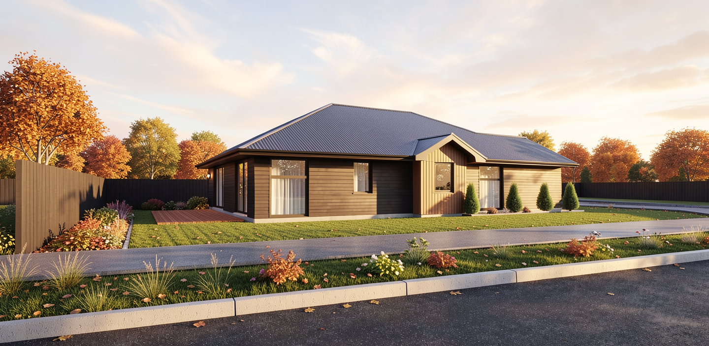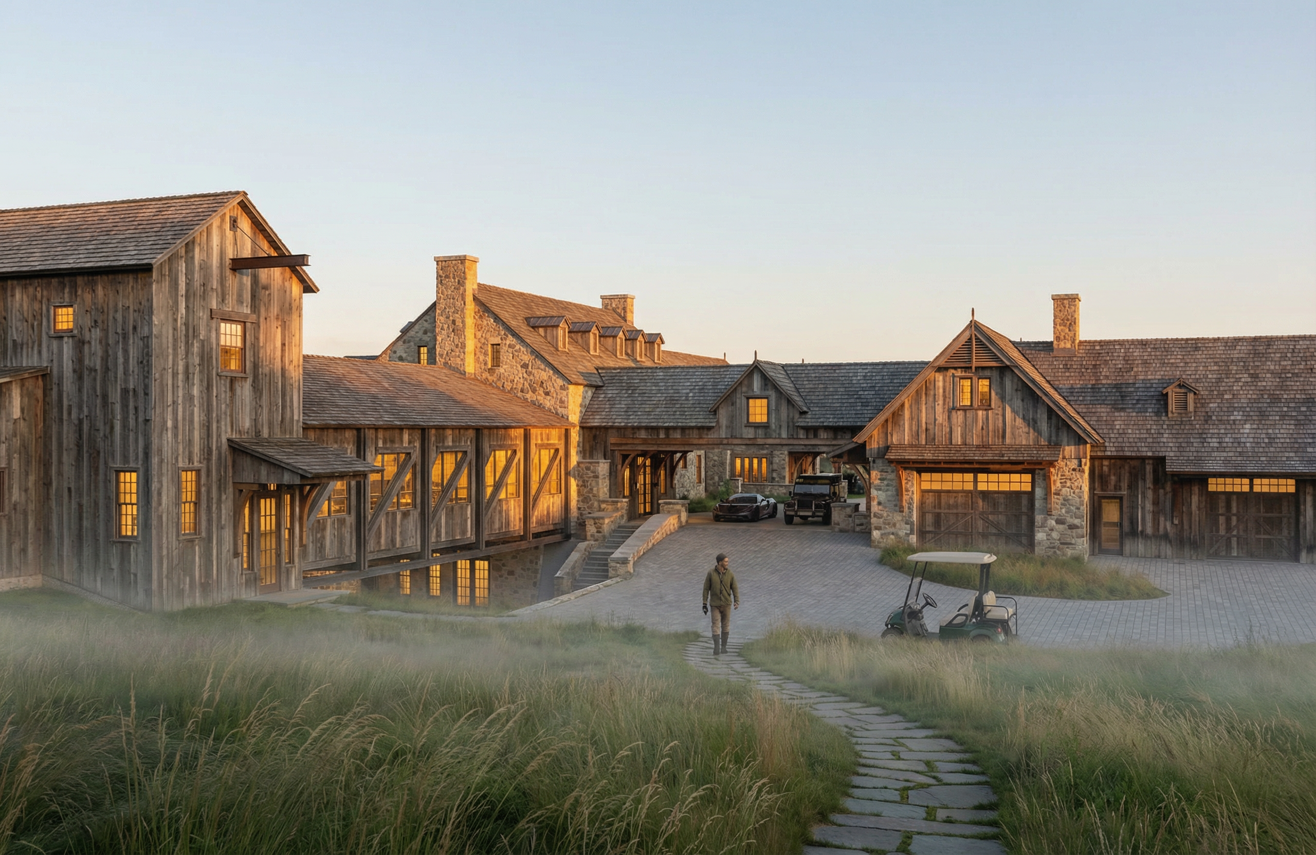 industrial design paver drive under cover tall grass with single person walking on stone path night fall sunlight on building face fog dynamic interior lighting