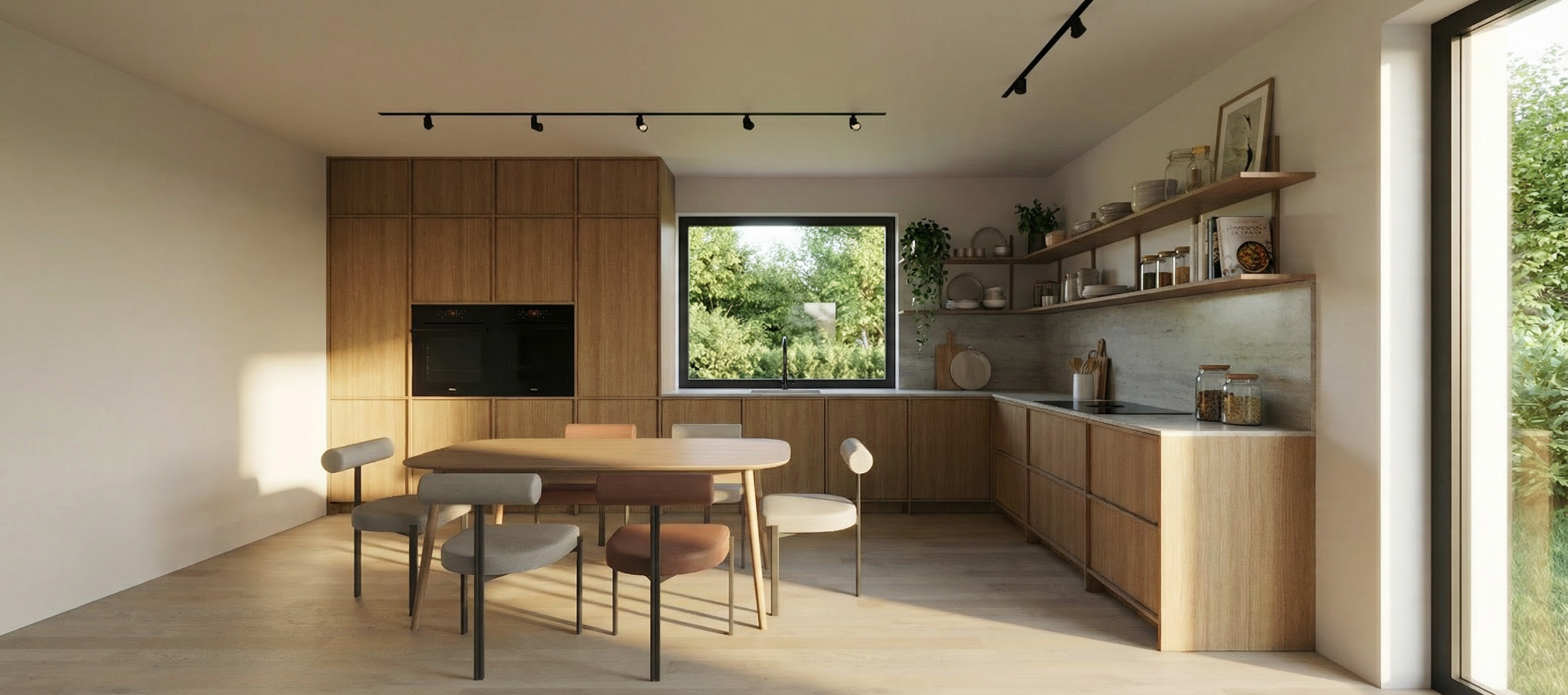 fai una versione moderna e minimalista raddrizza tutte le colonne storte con materiali pregiati dell edificio con sfondo con pini e case