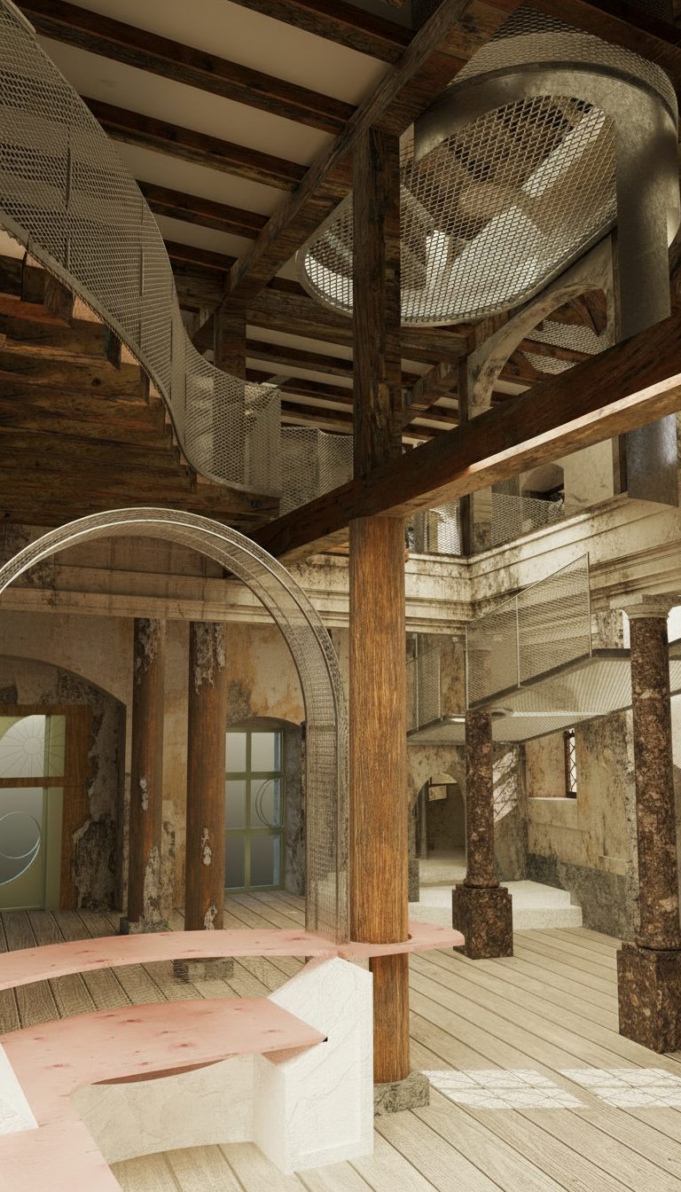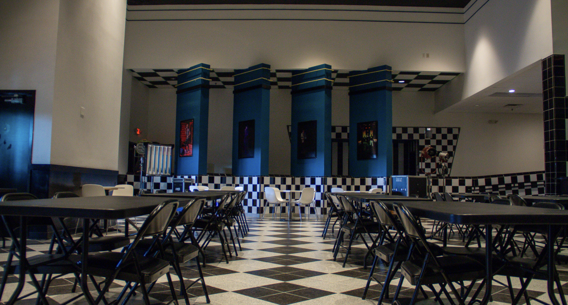 keep the background and floor the same but change the seating into a retro diner with booth seating on the left and right sides