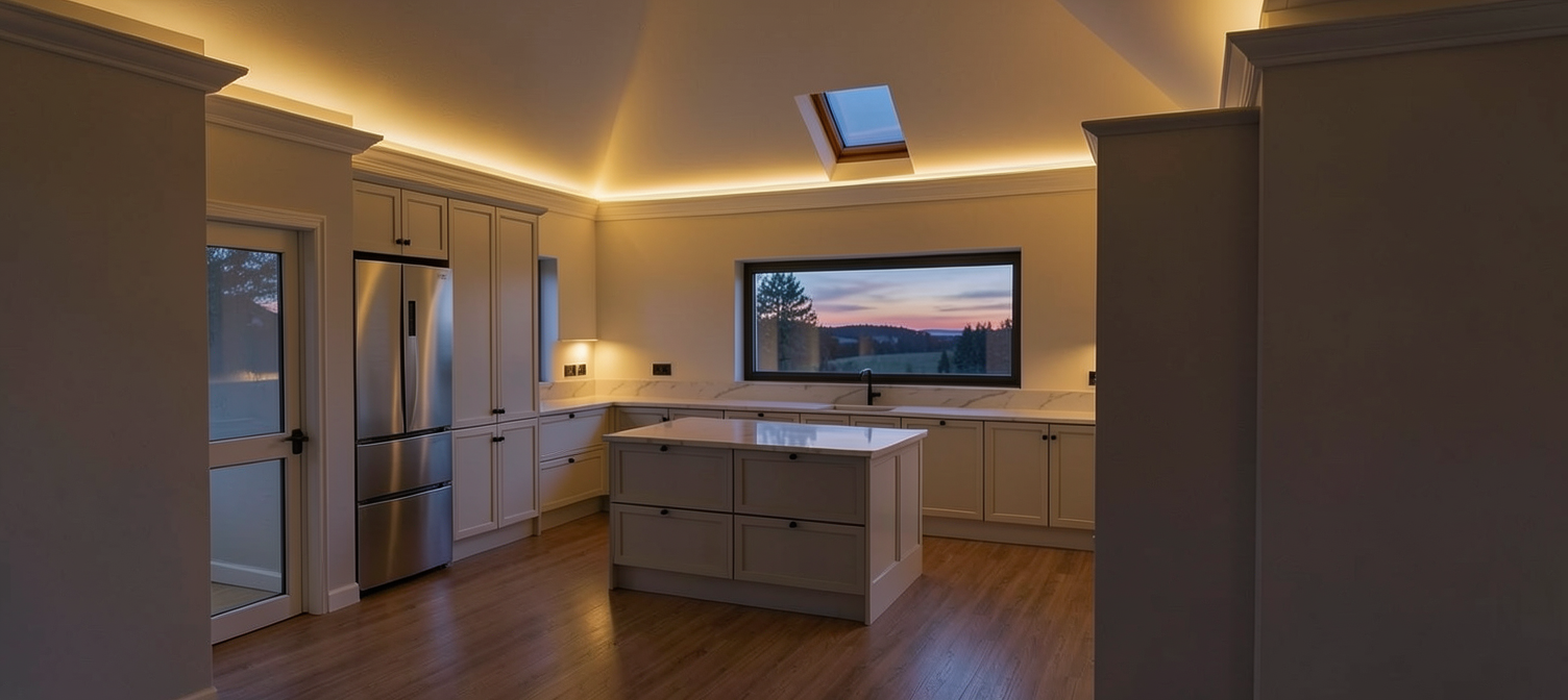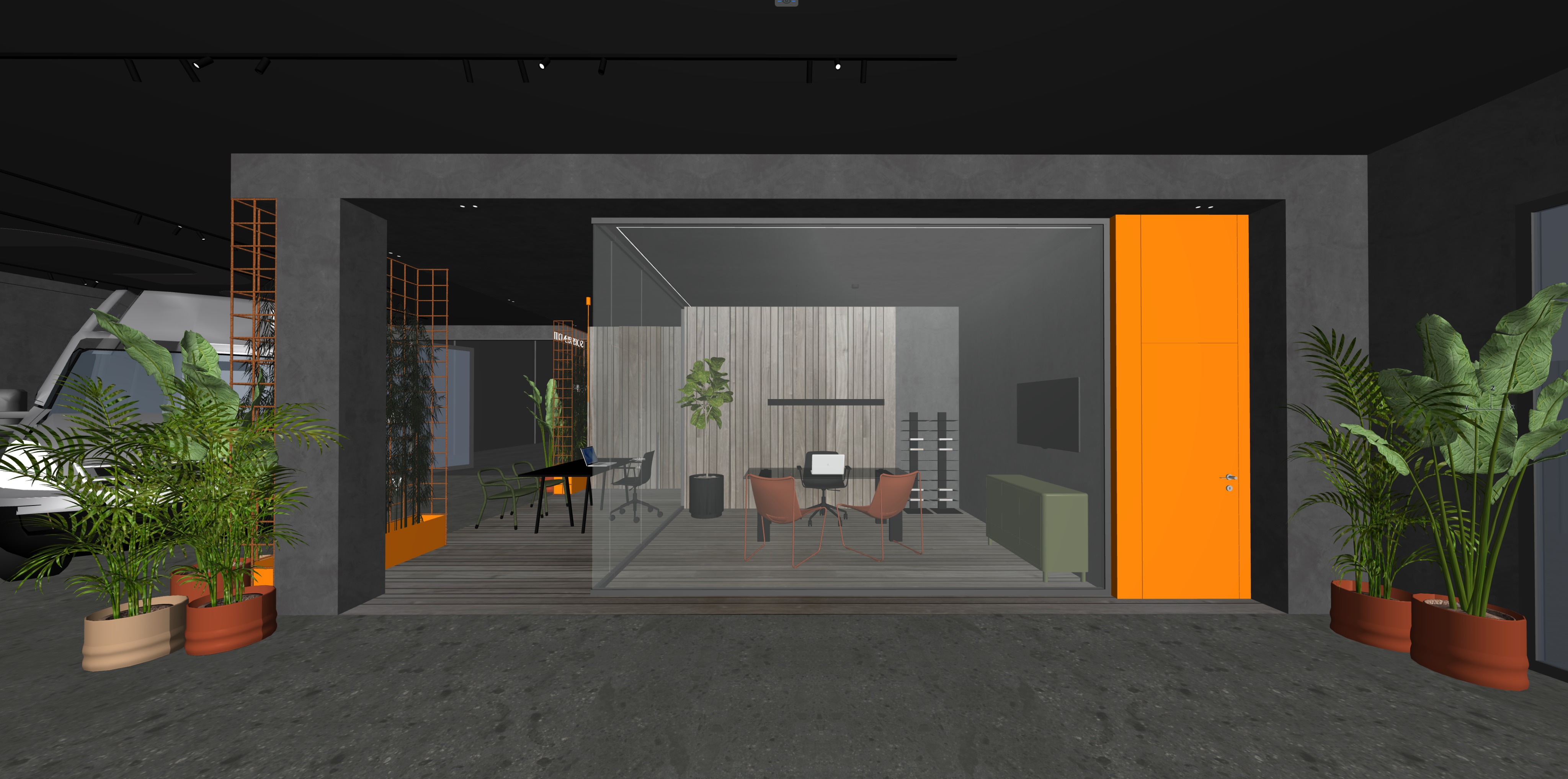 illumina la scena in modo diurno fai entrare luce naturale dall infisso a destra e anche da davanti mantieni texture e oggetti invariati legno a terra nella parte degli uffici stesse doghe della boiserie mantieni il resto del pavimento e del soffitto grigio scuro accendi luci strip led verticale alla fine della boiserie in legno che spara verso l angolo del muro grigio accendi tv accendi faretti binario a soffitto colore pavimento pi scuro pilastro specchio fum