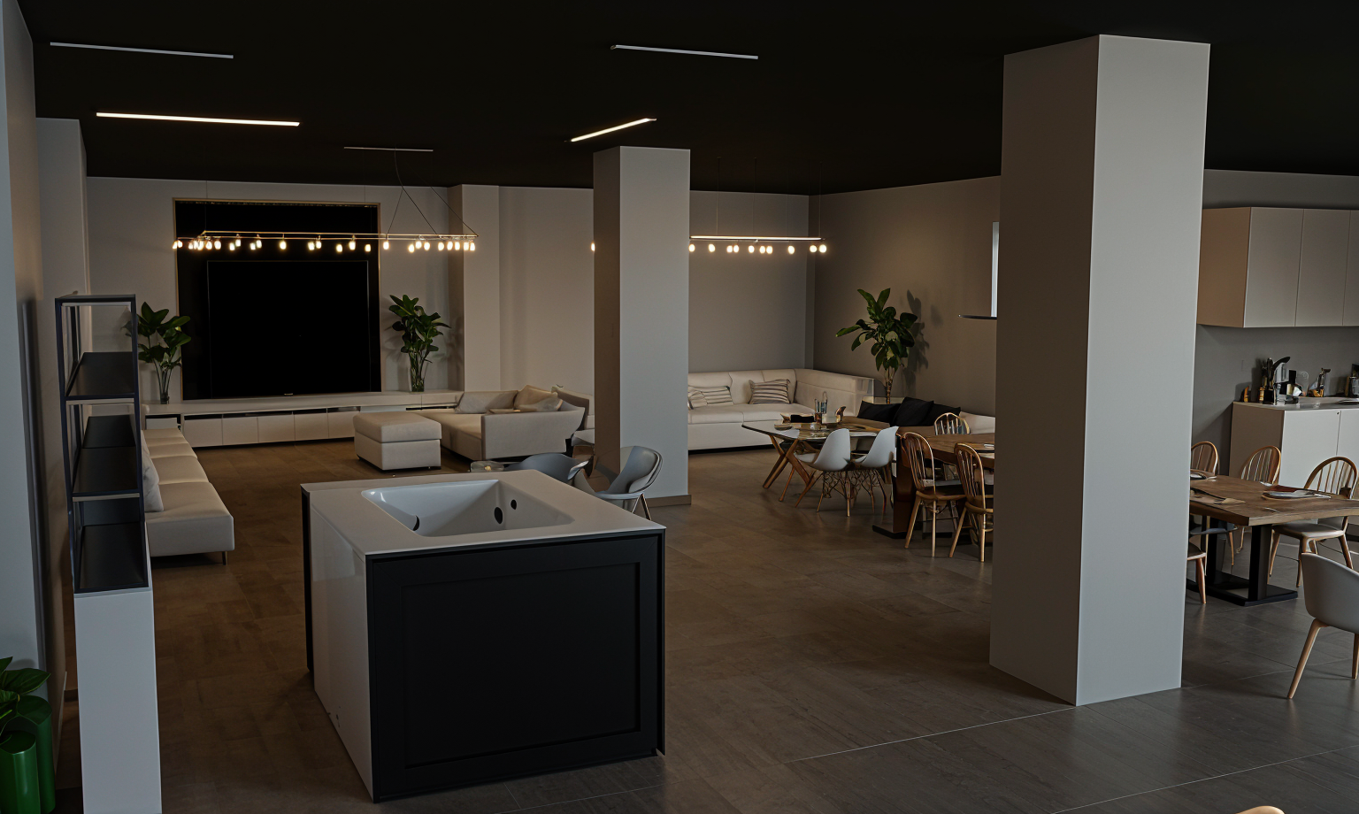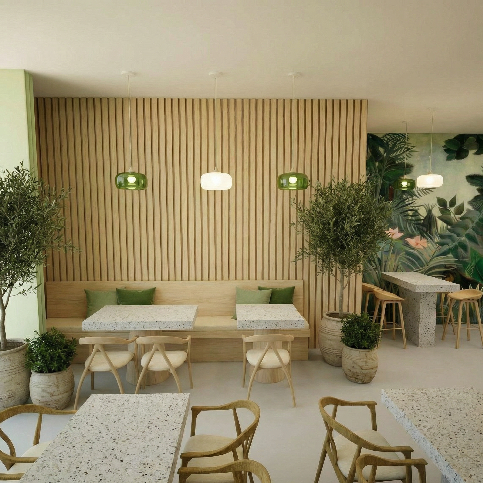 a number of very thin vertical crawling planting on the far right side of the building where the windows are clearly visible planting crawls up only from the concrete planter boxes on the second and third floors leaves are very small and the vines are very thin and barely visible