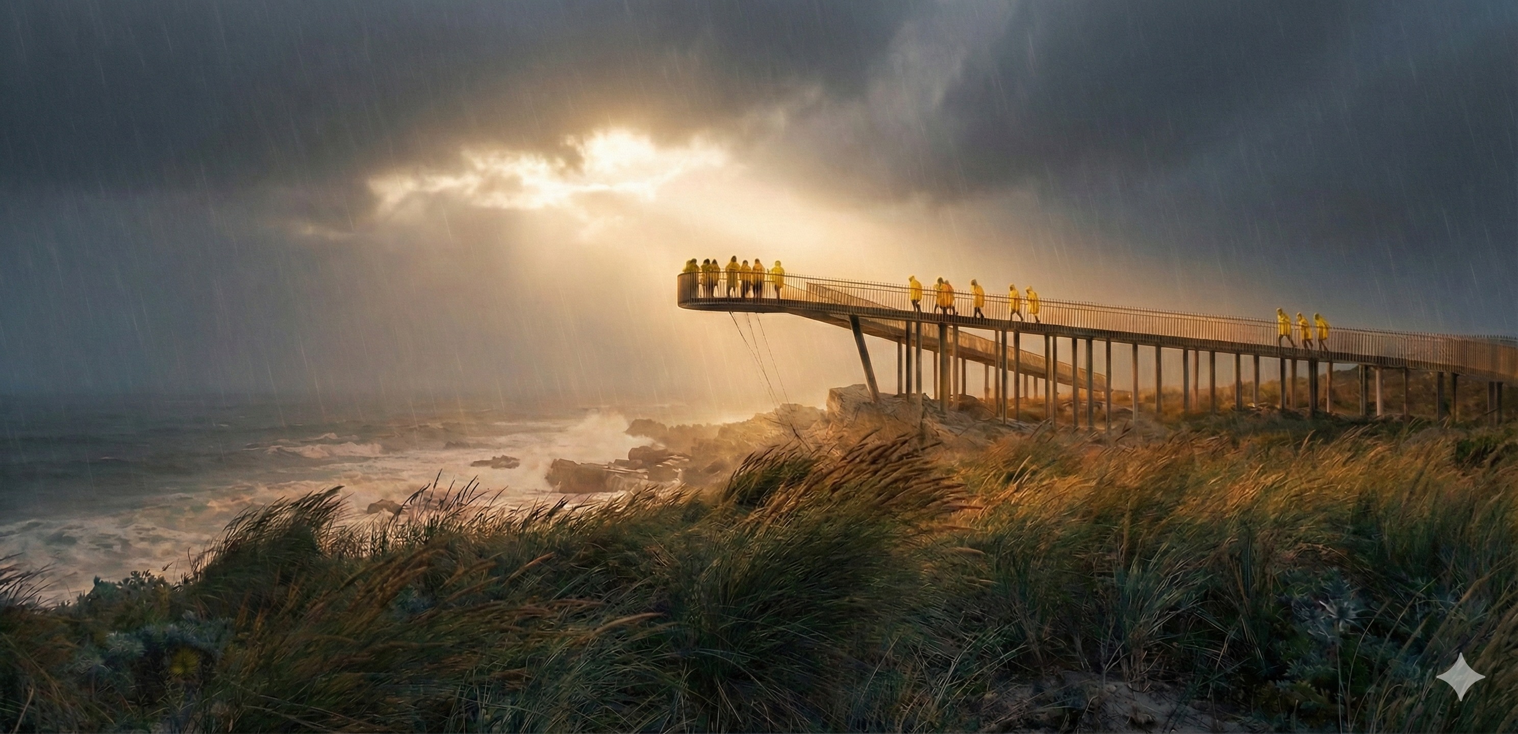 realistic coastal scene dramatic atmosphere stormy skies with dark grey clouds rays of sunlight breaking through illuminating a modern boardwalk people in bright yellow raincoats ocean waves crashing foreground with windswept green and brown grasses rain falling cinematic lighting serene yet intense mood