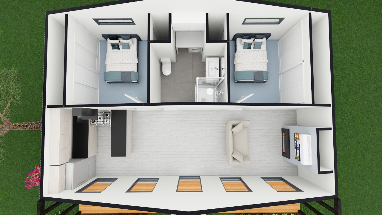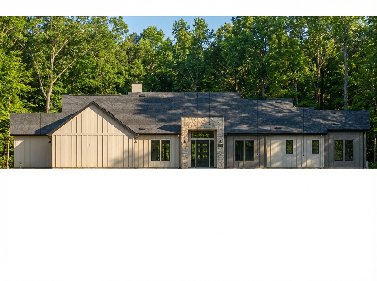 a modern minimalist house with a slanted roof featuring vertical siding in light gray the windows have black frames complementing the sleek black porch pillars the porch is made of warm brown wood surround the house with a vibrant garden bright pink bougainvillea on the left a variety of green succulents with orange flowers and clusters of light blue hydrangeas the lush green grass lawn extends around the scene set in a serene atmosphere with the golden light of a clear day casting soft shadows on the house and garden