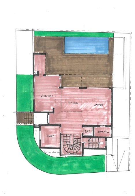 aerial shot render the above image do not change any geometry do not change the gaps in the thick black lines keep proportions and gaps exactly like they are this is a villa and should be rendered using the following materials shaded blue area use pool water the water is to have a lot of movement and reflection shaded brown area is the outdoor space use travertine tiling shaded green area put soil and trees in plan view do not change the curved area shaded pink area this is the indoor are so use a lighter travertine version where there is continues lines and arrows together these are stairs make them appear as stairs this has to be rendered ultrarealistic and include shadows all of the sketch should be showing in the frame do not include furniture do not change any geometry or openings the dotted lines should remain as dotted lines do not covert these into anything there is only one set of stairs outside and it is on the left side there are 2 set of stairs inside the pink shaded area one curved and one straight architecture