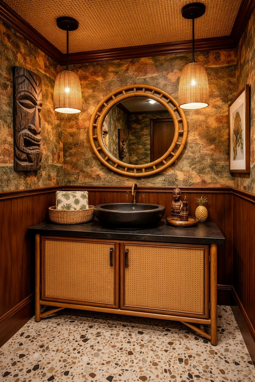 add 1950 s tiki inspired wallpaper above the wainscotting add bamboo to ceiling