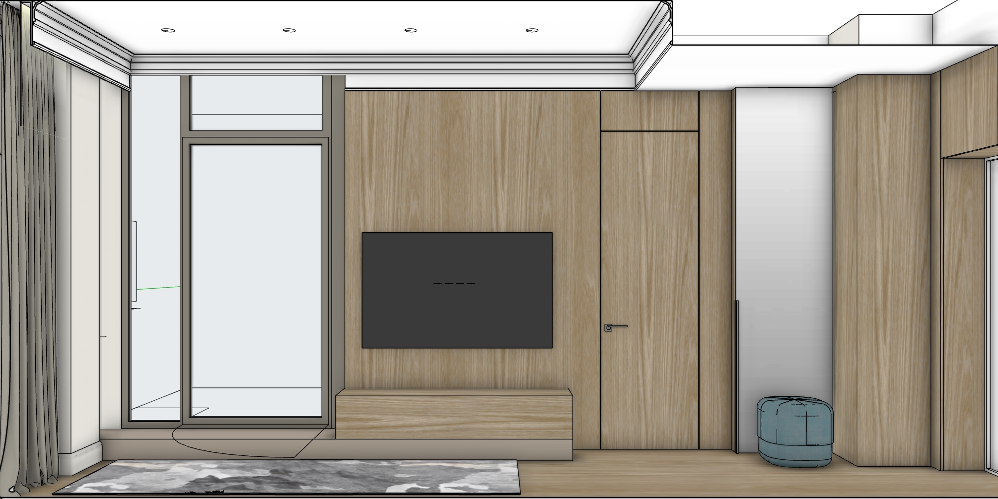 render a modern minimalist apartment layout with a cozy atmosphere use warm natural wood tones for the floor light gray for the sofa and neutral beige for the rug the bedroom should have a dark gray bedspread and white pillows incorporate soft lighting natural daylight through large windows and add lush green indoor plants for a touch of nature the kitchen should feature a marble countertop and subtle gray cabinetry emphasize a clean inviting space with harmonious colors and a peaceful ambiance