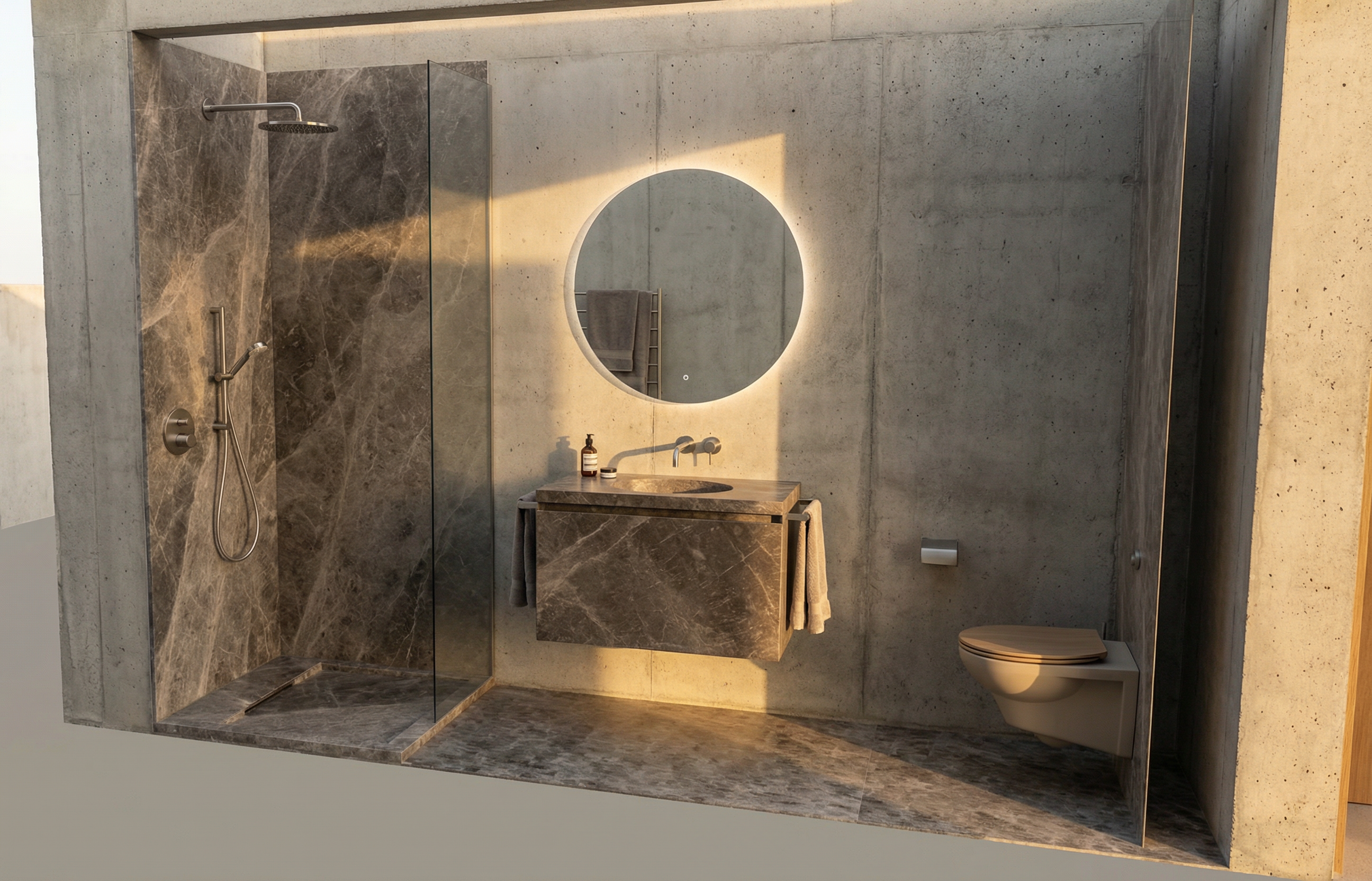 genau dieses rendering berarbeiten fotorealistisches innenraum foto exakt dieselbe perspektive und kameraposition wie das hochgeladene referenzbild 100 identische raumgeometrie exakt gleiche m belanordnung weiches nat rliches tageslicht leicht schr g einfallende sonne raum k nstlich ausleuchten sanfte realistische schatten blickrichtung ist nach osten sonnenlicht kommt von s den realistische materialien echte holztexturen stoff mit leichten gebrauchsspuren hochwertige oberfl chenreflexionen lavabo aus marmor collemandina grigio in braungrau dunkel dahinter eine vola wandarmatur edelstahl vollkommen rahmenloser und hinterleuchteter spiegel links neben dem lavabo ist die dusche thermostatmodul axor select mit stabhandbrause und grosse wandtellerkopfbrause w nde in der dusche und boden collemandina grigio in braungrau alle anderen sichtbaren w nde sind sichtbeton moderne toilette vertigo wandh ngend in farbe sabbia toilettenpapierhalter an der wand sehr moderner minimalistischer look nat rliche farbwiedergabe golden hour feeling das bild muss wie eine professionelle fotografie aussehen es soll ein echtes und reales foto sein canon eos r5 35 mm festbrennweite f 2 8 hyperrealistisch dslr qualit t raw aufnahme 8k aufl sung extrem scharf perfekte tiefensch rfe professionelle architekturfotografie