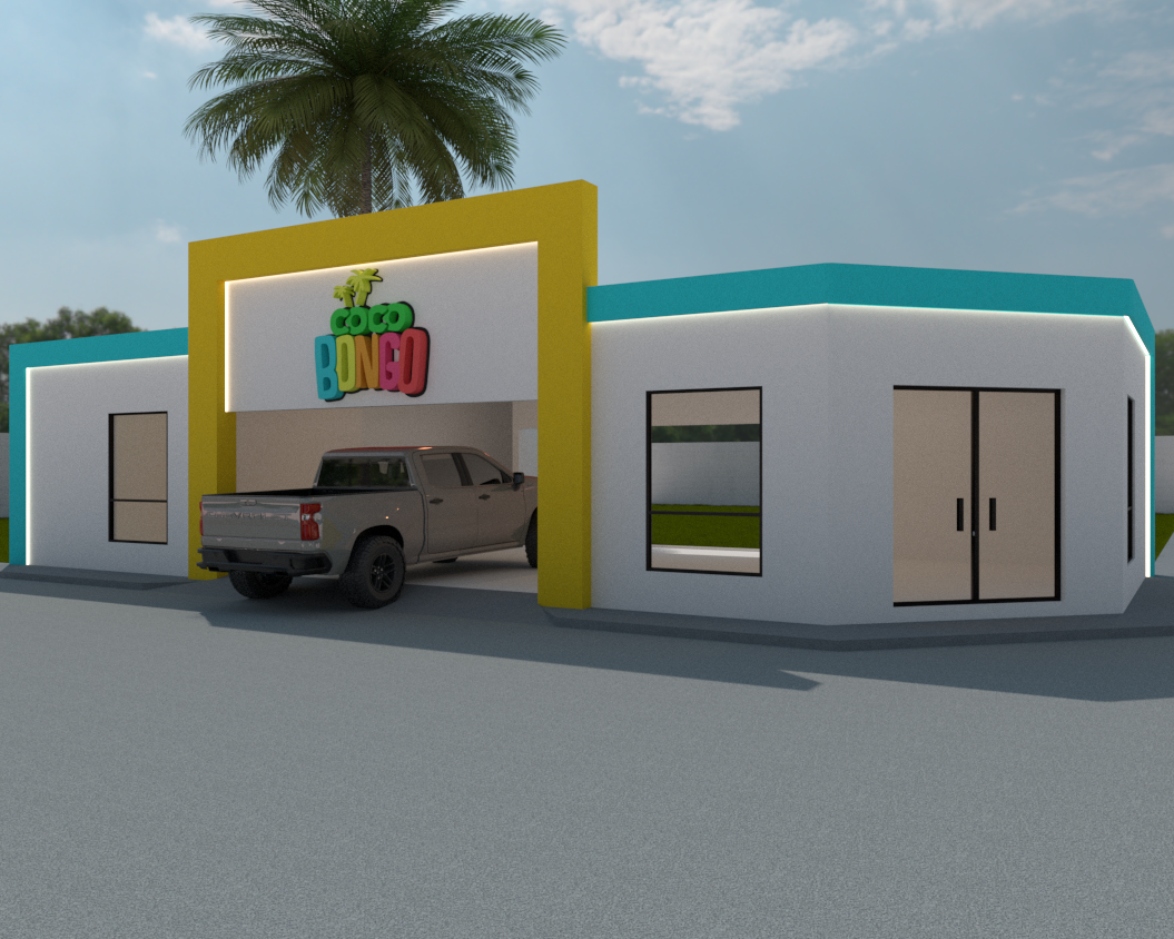 high quality materials modern drive through business clear windows with soft reflection realistic street and sidewalk sunny sky