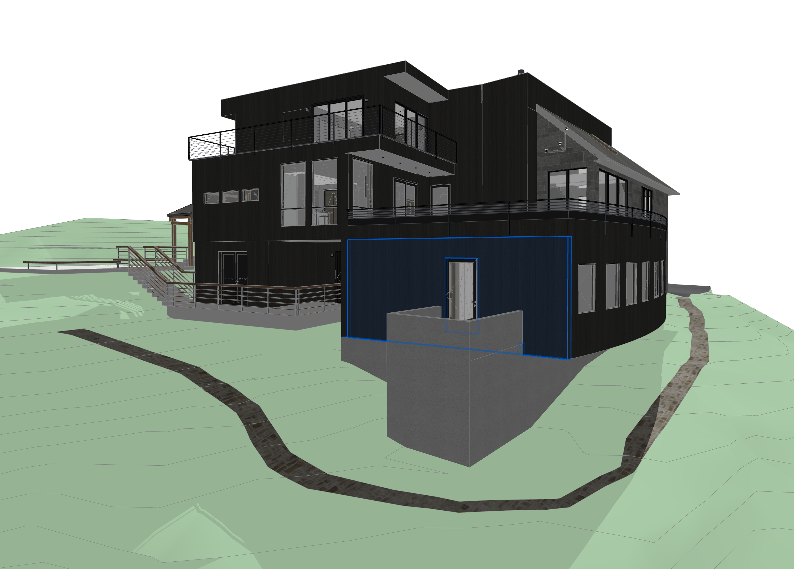do not change the view enhance the current materials and make the landscape nicer vegetation generate with snow for winter conditions hyper realistic architectural visualization quality 8k resolution render a photorealistic 3d perspective of this house located in snowmass co reference the current material style just enhance material keep model geometry the same windows doors roof walls garage door pavement driveway make a lush vegetation that looks native to snowmass co wood siding is dark grey almost black