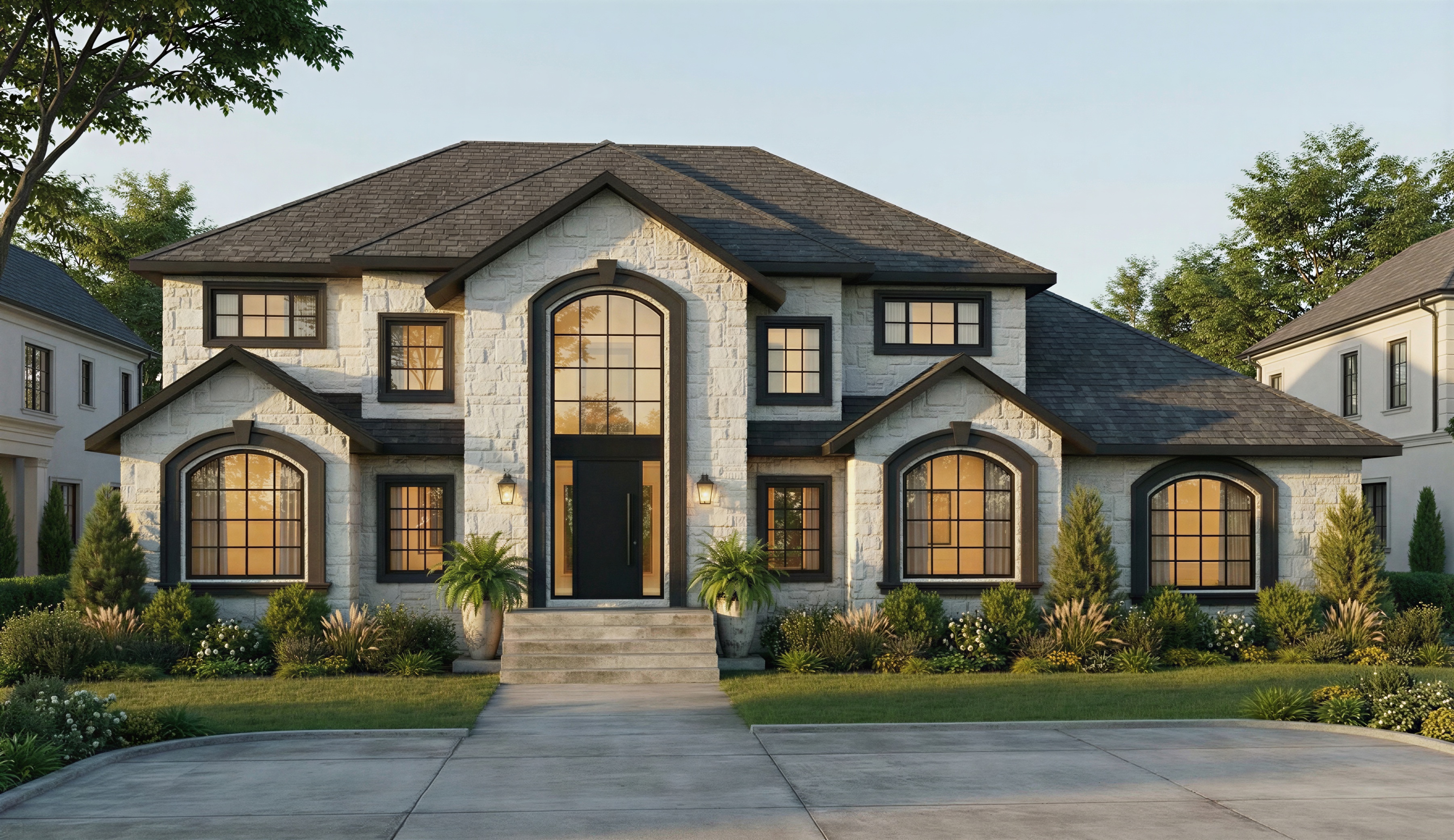 convert this image into a high end photorealistic luxury home render replace the front entry with a solid modern black door with a matte finish and sidelites on both sides strictly avoid any glass front door the main door must be solid black and opaque remove all heavy wood trim and wood framing around windows completely do not use any wood material on window surrounds replace all window trim with clean thin modern black metal or painted trim with minimal thickness and sharp edges ensure a refined contemporary luxury appearance maintain detailed black mullions with divided light grids but keep proportions elegant and not bulky enhance all materials for realism natural stone variation refined roof shingles realistic glass reflections and warm interior lighting place the home in a quiet upscale sophisticated urban neighborhood with subtle surrounding homes mature trees and clean sidewalks keep the background soft and secondary upgrade landscaping and lighting for a premium real estate look with soft natural or golden hour lighting and realistic shadows