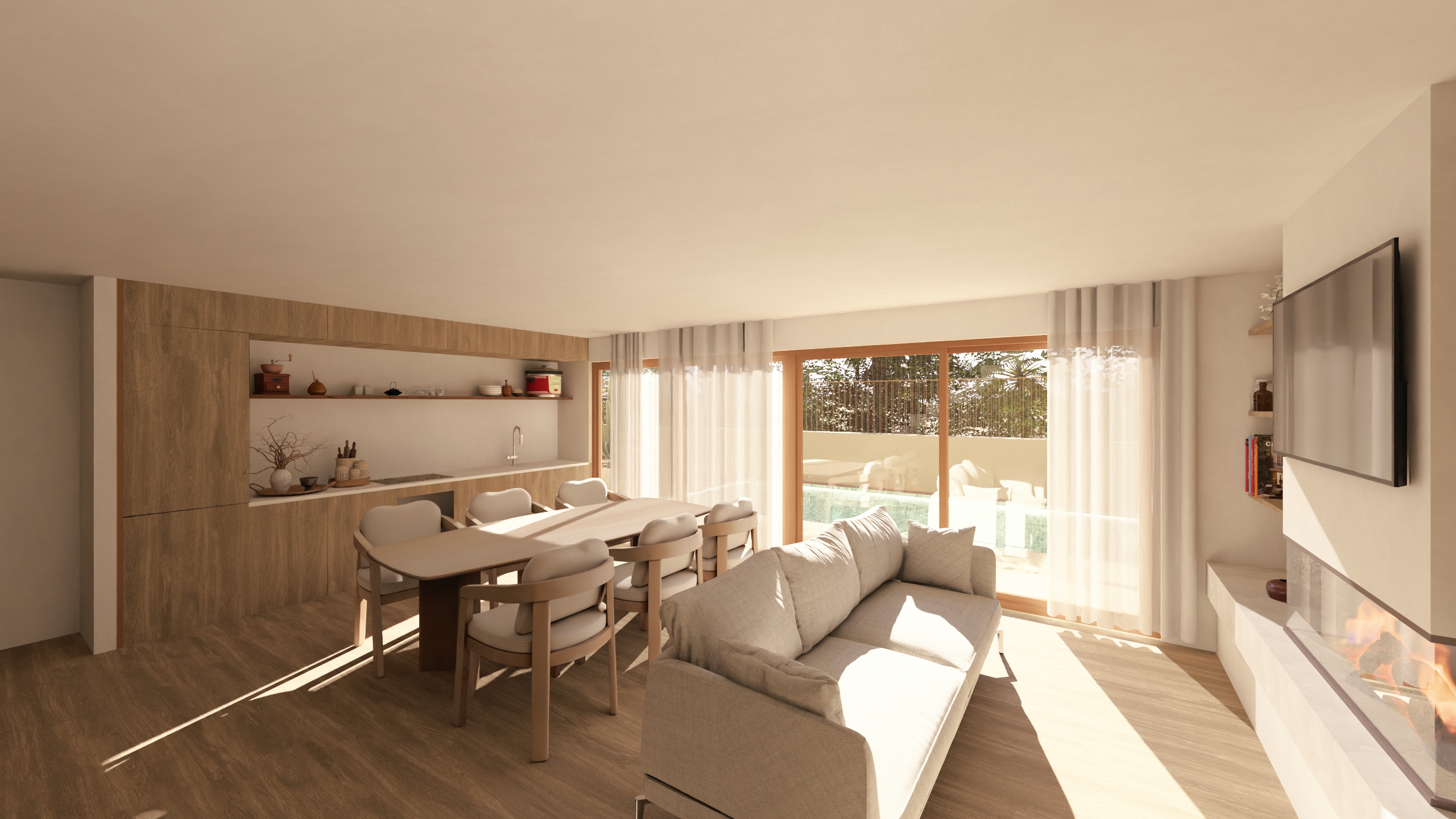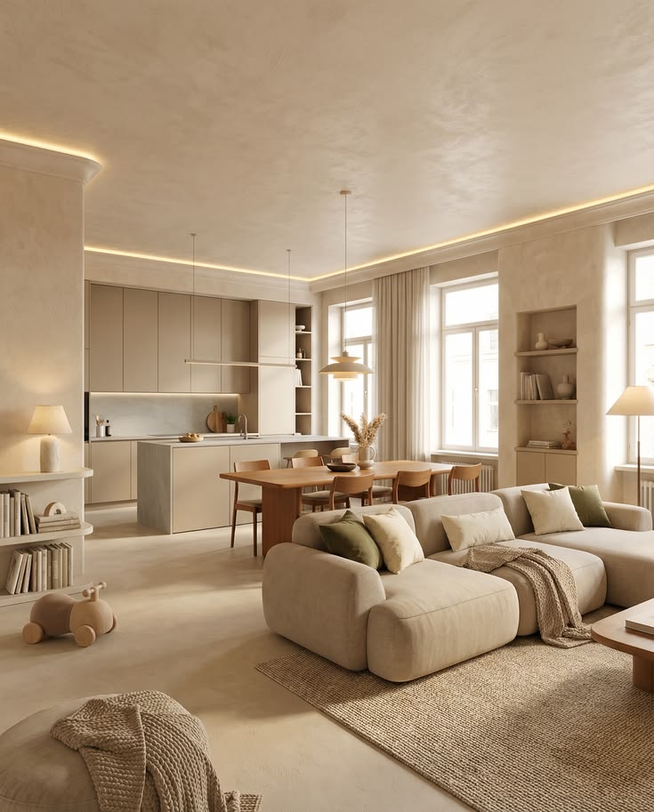 exterior shot use the reference image of a living room dining area kitchen as a completely fixed base absolute rules do not break keep the exact same camera position angle framing and perspective do not move rotate resize or replace any object do not modify layout structure or composition sofa dining table chairs kitchen cabinets appliances walls and all elements must remain exactly identical in position and proportions only allowed actions replace and improve materials with high quality realistic textures wood stone marble fabric metal glass etc enhance surface detail fabric texture wood grain stone veins reflections subtle imperfections improve finishes matte satin polished brushed metal etc enhance lighting realism natural light soft shadows global illumination do not add or remove furniture change shapes silhouettes or volumes add decorative elements that alter composition block or hide any existing object style tu estilo aqu look ultra realistic architectural visualization high detail physically accurate materials if any object position size layout or camera changes the result is invalid