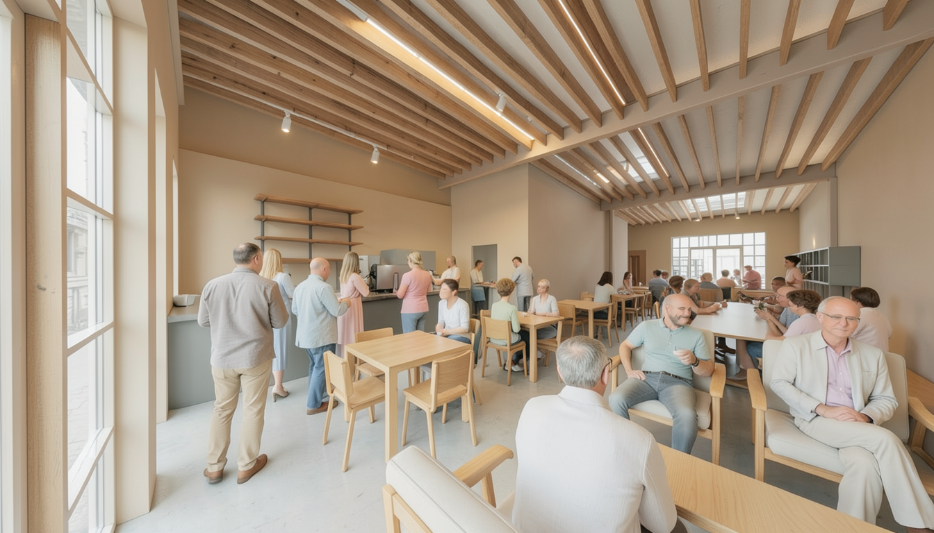 a bustling modern cafe interior filled with people wooden beams soft ambient lighting filters through large windows walls painted in warm beige tones flooring in light concrete tables and chairs are wooden and minimalist in design featuring a mix of white and light grey people are casually dressed in light pastel colors enhancing a relaxed and welcoming atmosphere shelving and countertops in muted grey tones rendered at nighttime with a harmonious and tranquil color palette