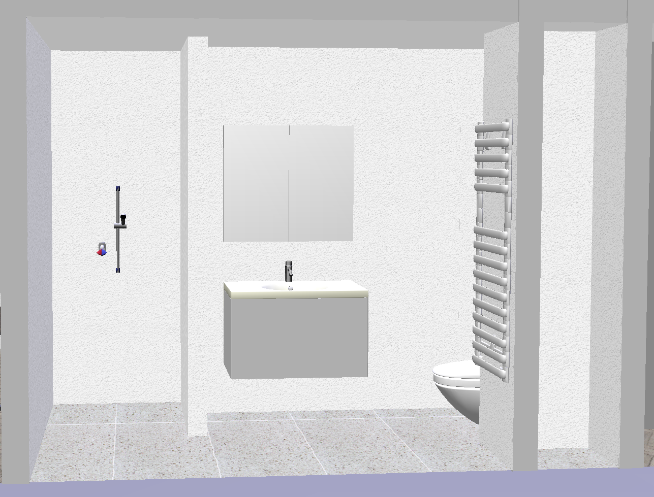 genau dieses rendering berarbeiten fotorealistisches innenraum foto exakt dieselbe perspektive und kameraposition wie das hochgeladene referenzbild 100 identische raumgeometrie exakt gleiche m belanordnung weiches nat rliches tageslicht leicht schr g einfallende sonne raum k nstlich ausleuchten sanfte realistische schatten blickrichtung ist nach osten sonnenlicht kommt von s den realistische materialien echte holztexturen stoff mit leichten gebrauchsspuren hochwertige oberfl chenreflexionen lavabo aus marmor collemandina grigio in braungrau dunkel dahinter eine vola wandarmatur edelstahl vollkommen rahmenloser und bis auf f nf zentimeter versenkter und hinterleuchteter spiegelschrank links neben dem lavabo ist die dusche thermostatmodul axor select mit stabhandbrause und grosse wandtellerkopfbrause w nde in der dusche und boden collemandina grigio in braungrau alle anderen sichtbaren w nde sind sichtbeton die toilette ist in der nische hinten auf der rechten seite moderne toilette vertigo wandh ngend in farbe sabbia tecelux bet tigungsplatte toilettenpapierhalter in edelstahl an der wand links von der toilette an der grossen wand handtuchradiator in edelstahl an der fl gelwand auf der rechten seite schwarze steckdose rechts vom lavabo schwarze runde deckenspots in der nische vorne rechts ist die unsichtbare installationszone sehr moderner minimalistischer look nat rliche farbwiedergabe golden hour feeling das bild muss wie eine professionelle fotografie aussehen es soll ein echtes und reales foto sein canon eos r5 35 mm festbrennweite f 2 8 hyperrealistisch dslr qualit t raw aufnahme 8k aufl sung extrem scharf perfekte tiefensch rfe professionelle architekturfotografie