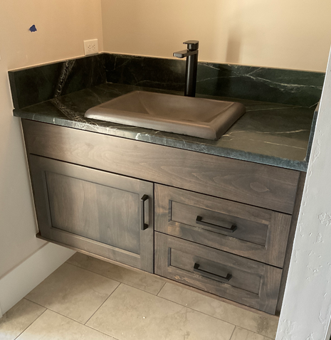 do not change the cabinets in any way preserve the exact cabinet colors materials finishes dimensions door and drawer styles hardware spacing alignment and all geometry exactly as shown do not alter the countertop shape backsplash appliances flooring lighting fixtures or wall structure only remove the construction materials clutter and mess from the scene clean the room and make it look finished and staged add a few simple tasteful home accessories appropriate for the style of the space but do not add or remove any furniture windows or architectural elements maintain the original lighting direction and realism enhance clarity and polish the photo while keeping the cabinetry and room design completely unchanged do not alter the lighting to keep the cabinet colors as they are in the image add a frameless mirror above the vanity stage the countertop for a bath vanity