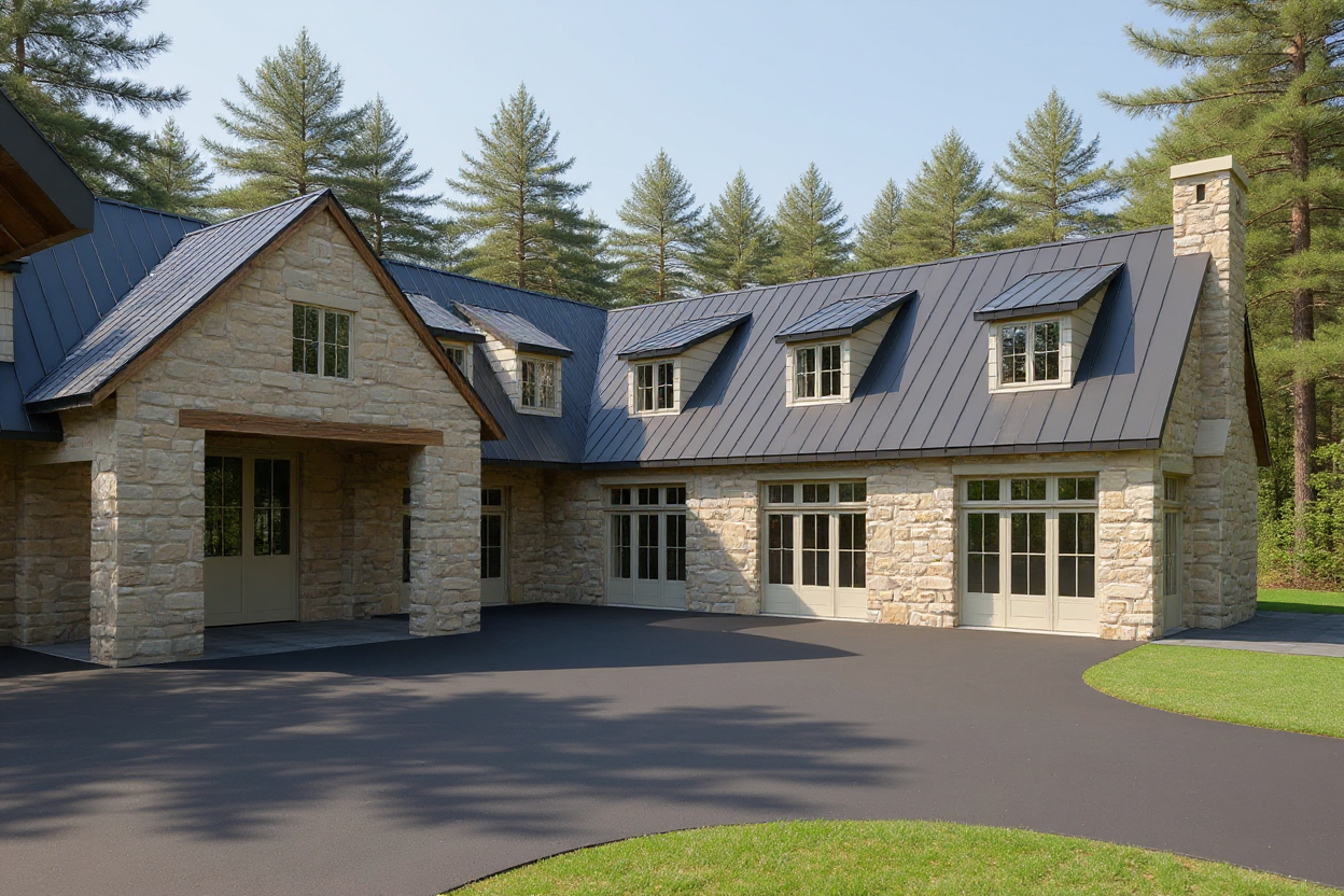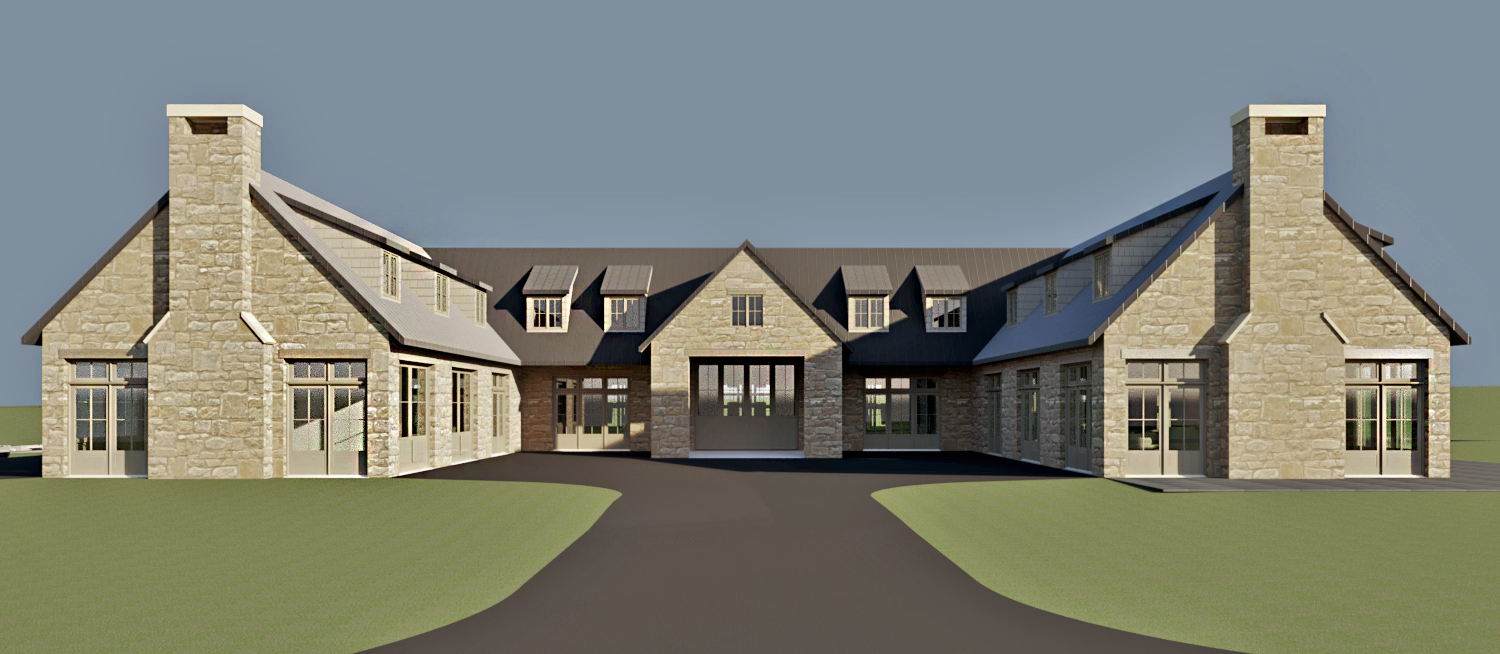 equetrian french country garage and guest house in northern wisconsin with woods in background full stone exterior rough hewn wood headers over all windows and doors graphite colored standing seam metal roof