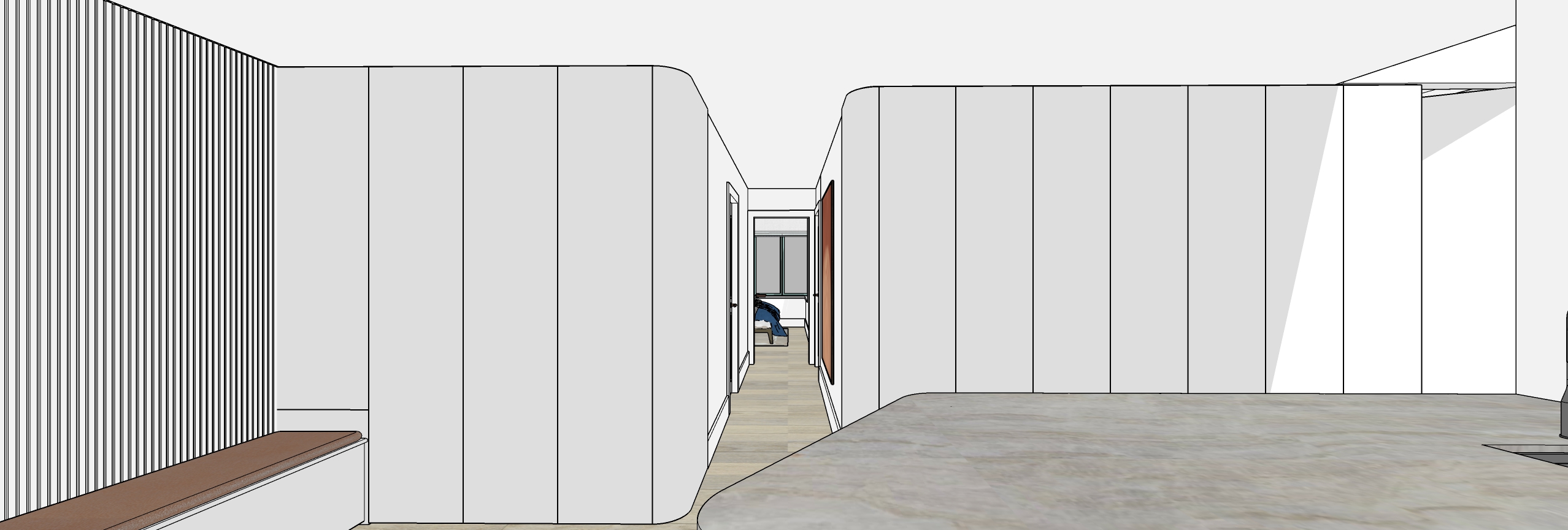 left hand side wall cladding to have upholstered seat and hanging coats