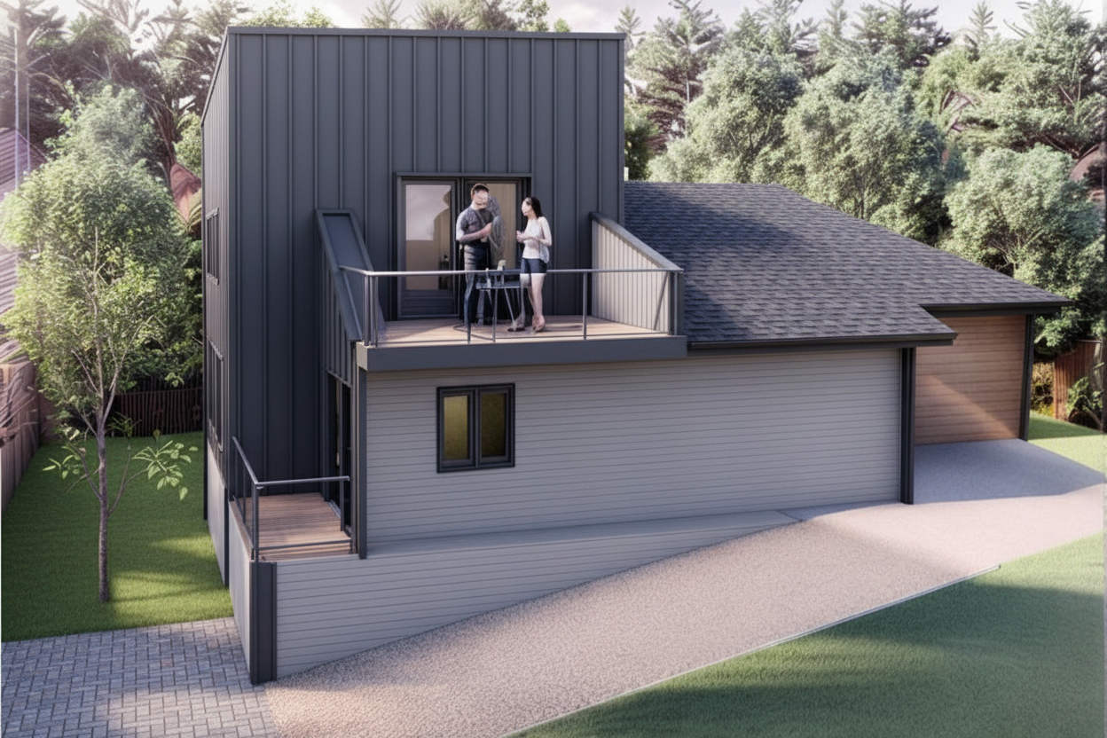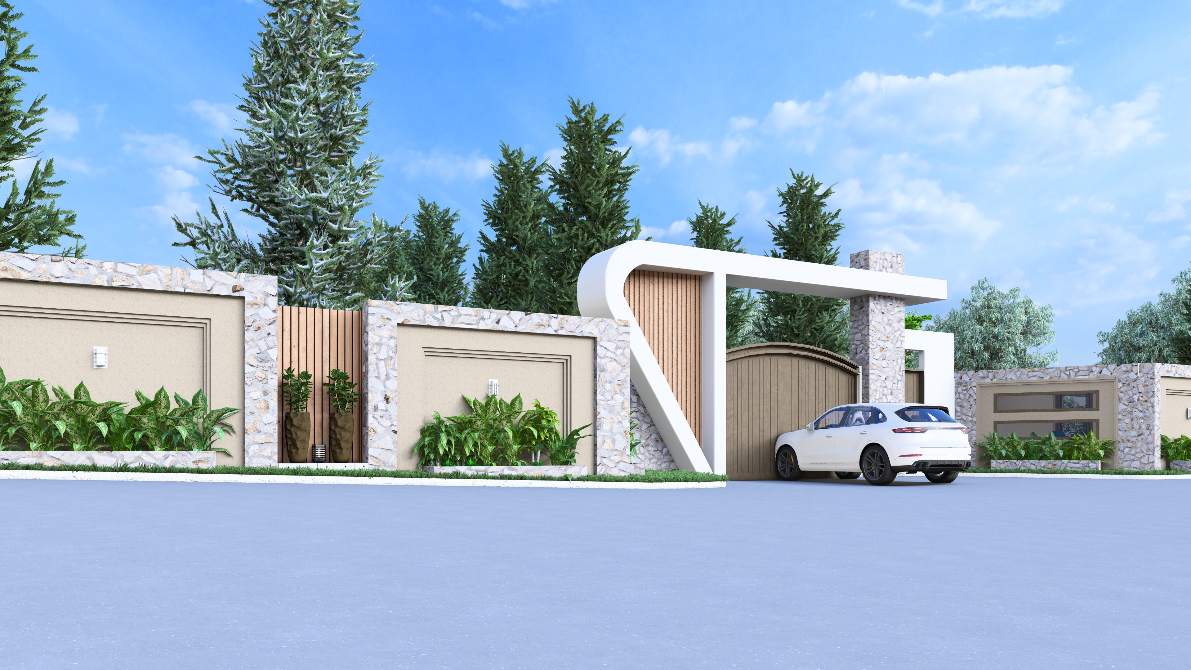 this is a boundary wall with different texxtures natural stone wpc wooden flute and plastered mid section with wall sconces lighten uo the wall sconces in the mid sections just a bit but do not make scene dark maintain it s daylighting give the potted plants a brighter colour match it with the painted wall add some intricate details golden to the gate near the far right infront of the car to make it more dominant and stand out