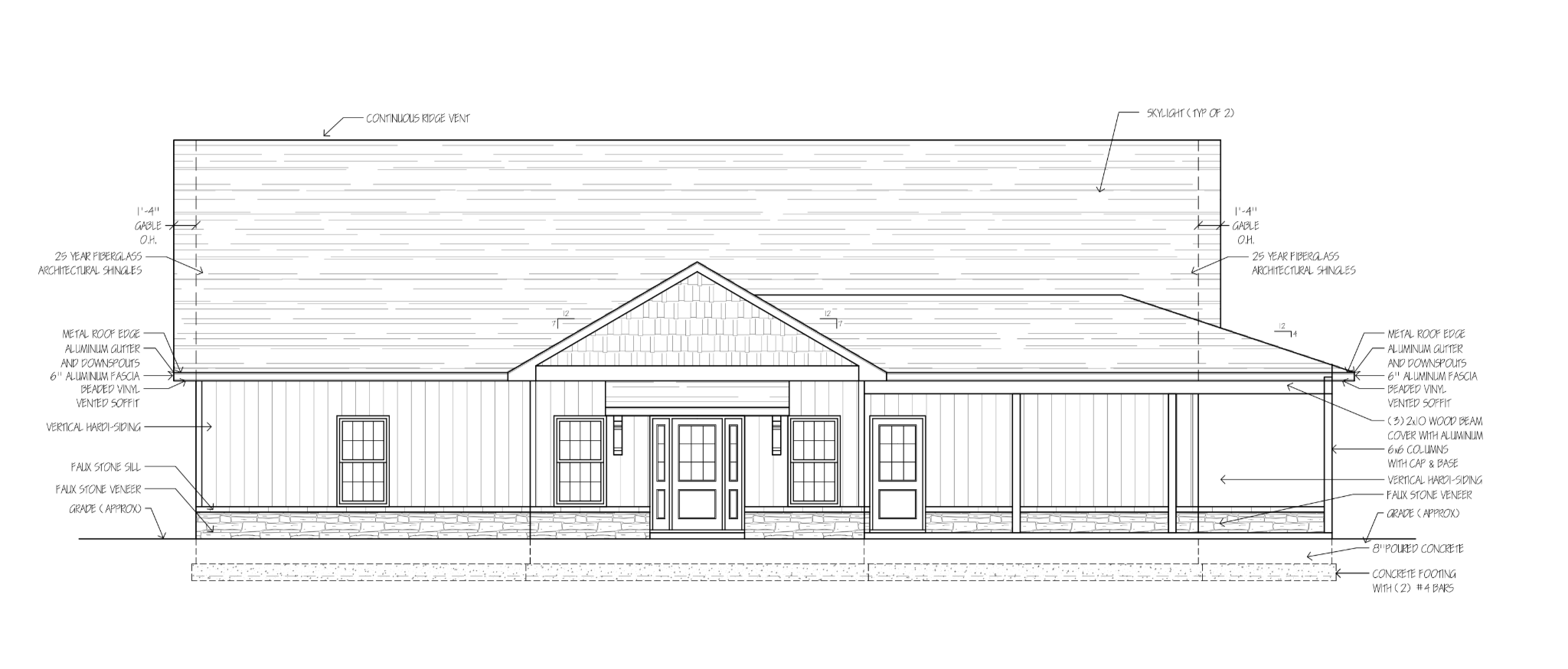 please add a pop of color to this cad elevation the cedar shakes at gable end and board batten siding should be colored in certainteed sable brown the windows will be vinyl white but the trim around the windows and all of the doors will be scarlett red as seen in the j e manufacturer color palette the brackets holding up the awning over the stoop and all porch posts should be an amber cedar stain color the main roof should be certainteed asphalt color max def red oak the masonry stone should be color anchor gray ledgestone by nitterhouse stone all other trim to separate the roof and gable end should be white to match the white vinyl windows