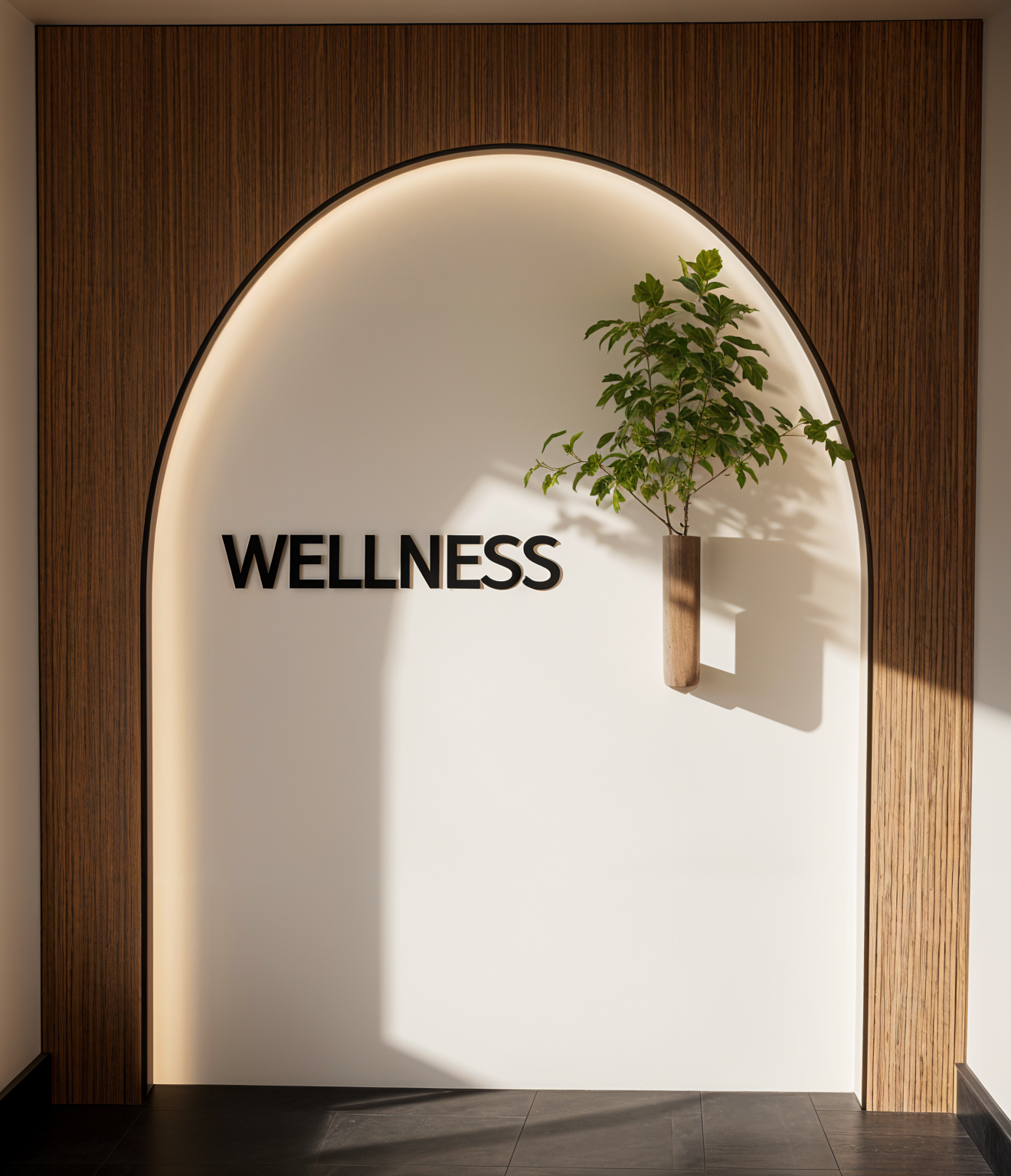 archway with reeded wood texture highlighted by soft ambient lighting white wall with wellness in bold black letters with backlighting a botanical element with vibrant green leaves in a sleek earth toned vase the atmosphere is tranquil and inviting embodying a contemporary spa like experience floor is a deep charcoal enhancing the serene ambiance