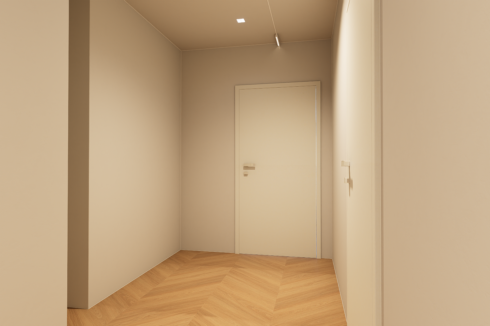 modern minimalistick vstupn hala v tepl ch pr rodn ch a svetl ch t noch na avej strane je vstavan skri a s lo n m priestorom ve iakmi na kab ty a policami na top nky celkov dizajn je elegantn funk n a vzdu n s d razom na jednoduch l nie a pr jemn atmosf ru materi ly ako svetl drevo biela farba a b ov odtiene priestor by mal p sobi priestranne a organizovane