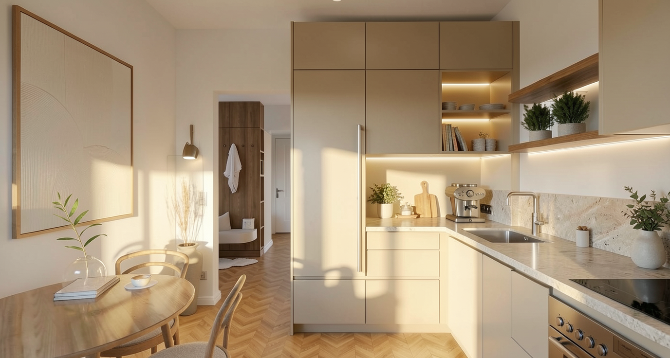 the wall sconces are soft brown toned murano glass the vanity cabinetry is white polyurethane which a reclaimed timber kickboard golden hour dusk time of day