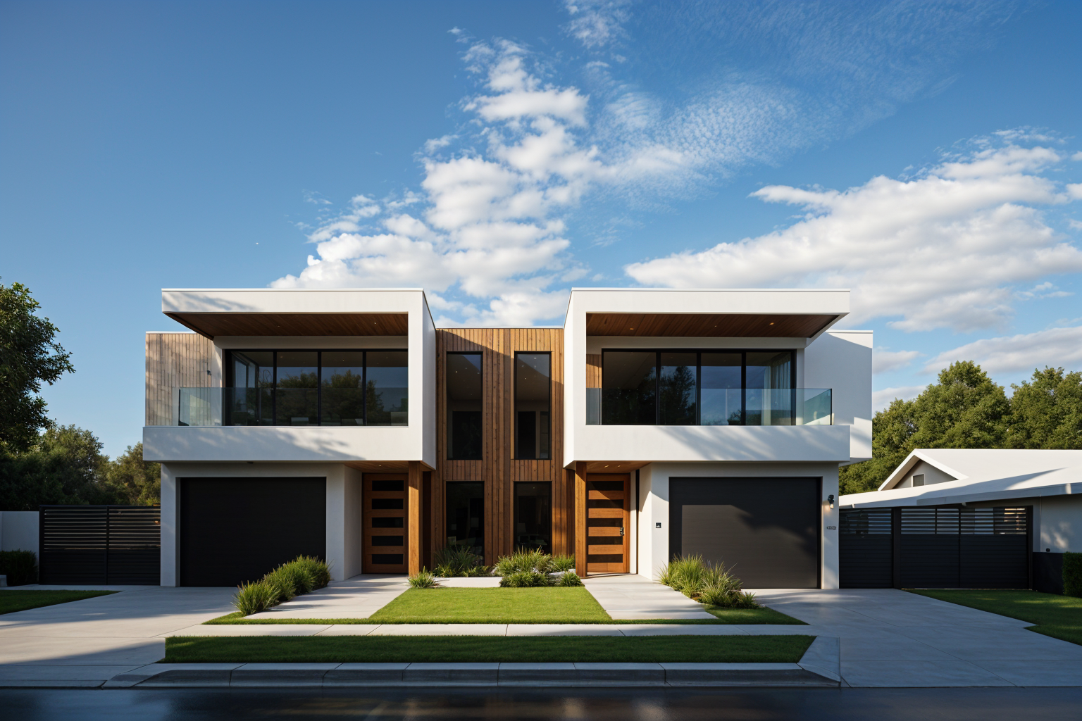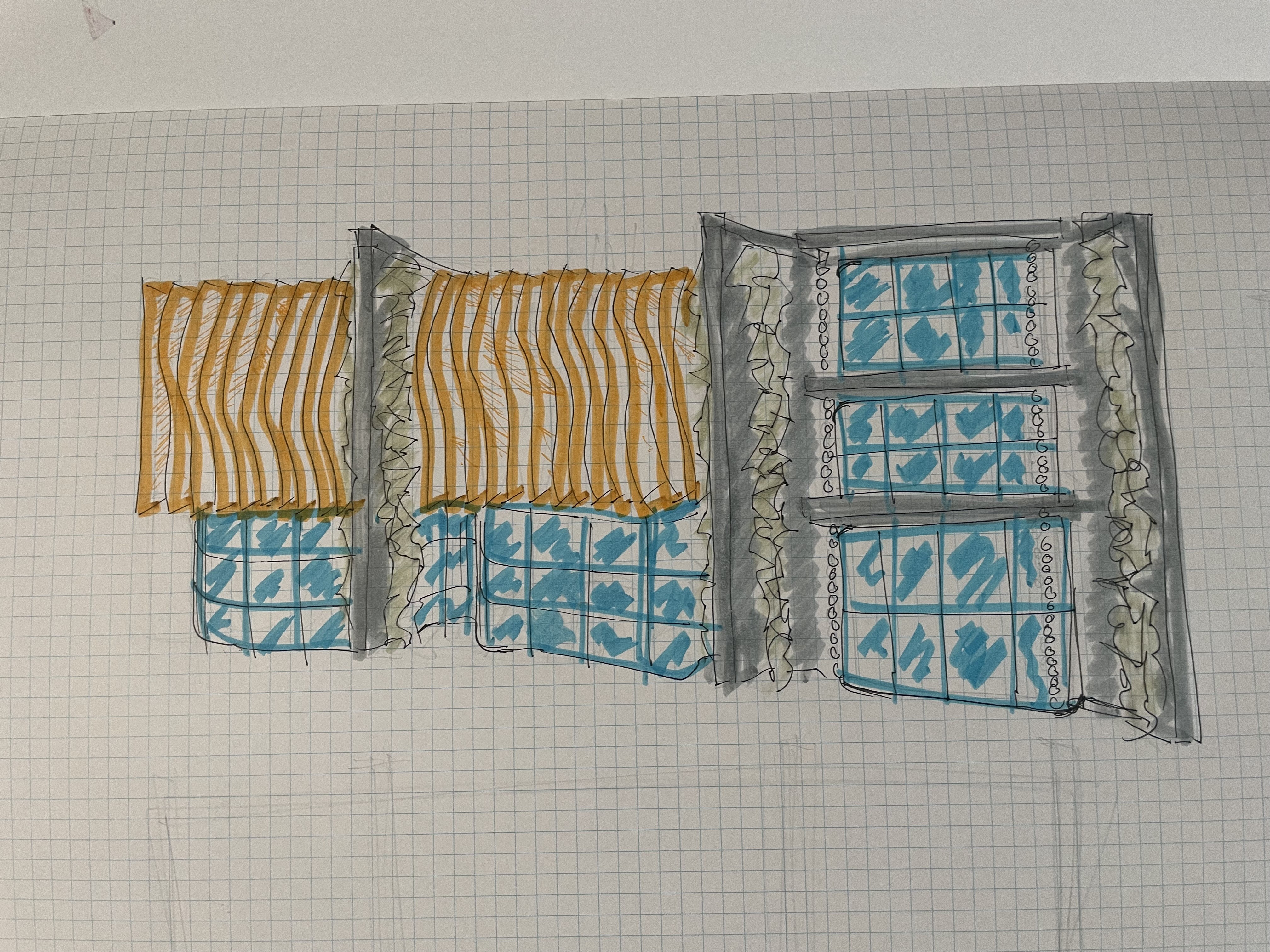 perspective shot perspective view of a modern building with wavy timber batten vertical louvres heavy concrete vertical divisions with vertical planting hanging down glass to lower half of the buildng