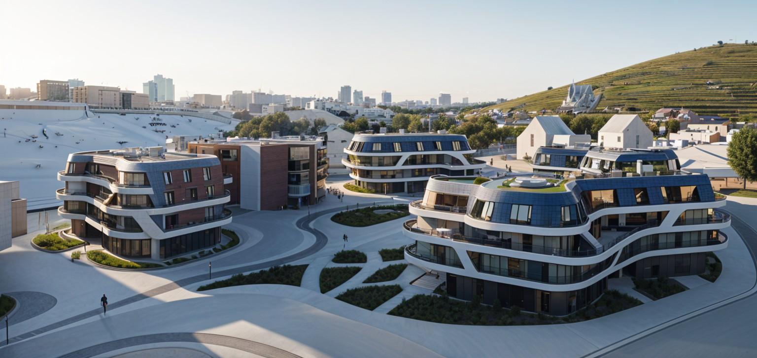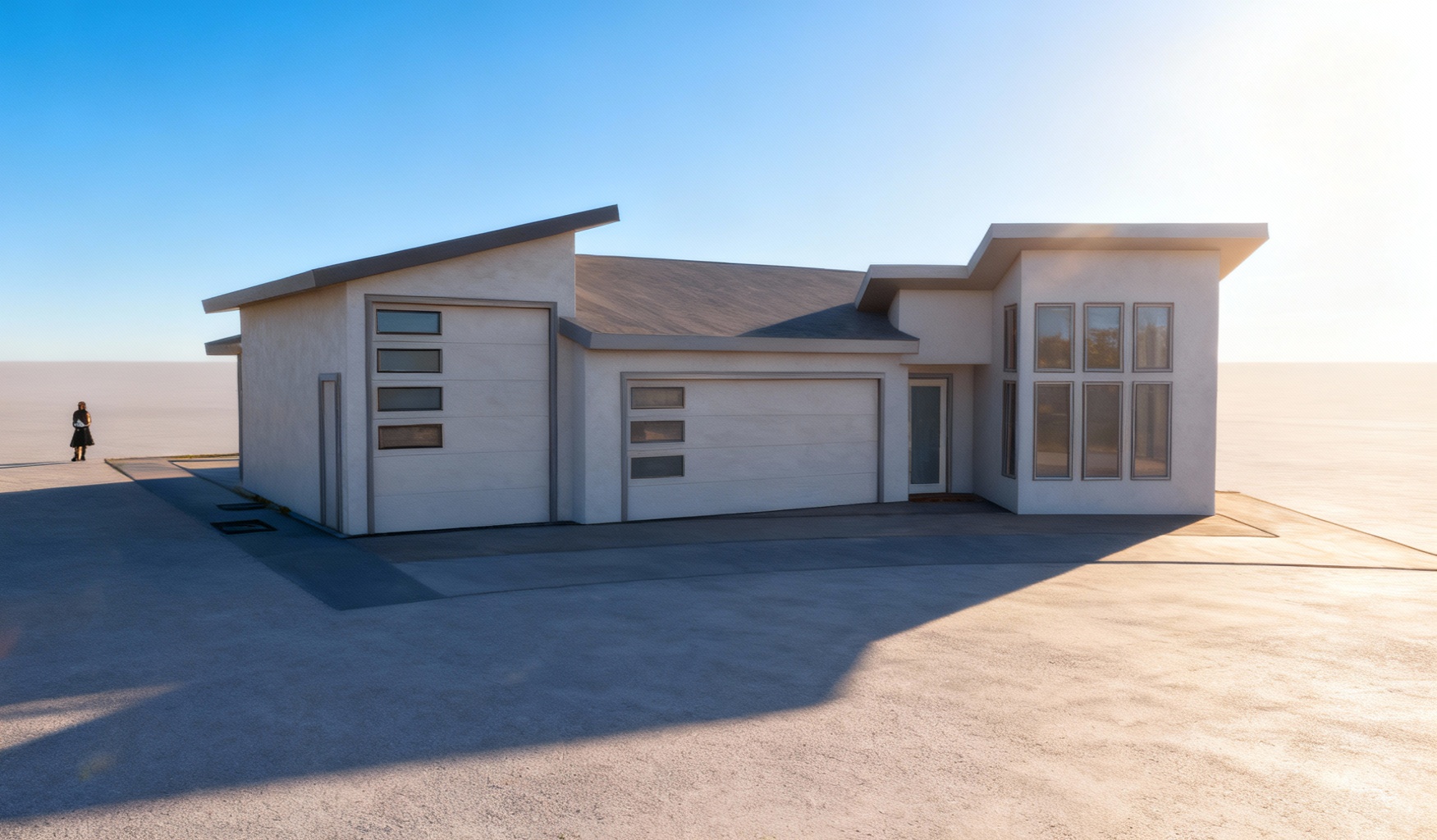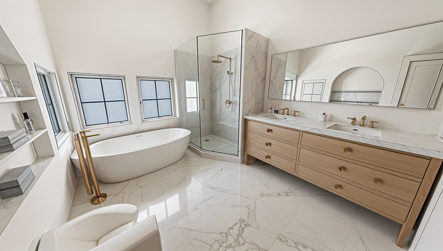 finish the render shower and floor white marble with dramatic veins brass hardware white bathtub white shelves light brown beige vanity with white marble top white walls show outdoor in windows